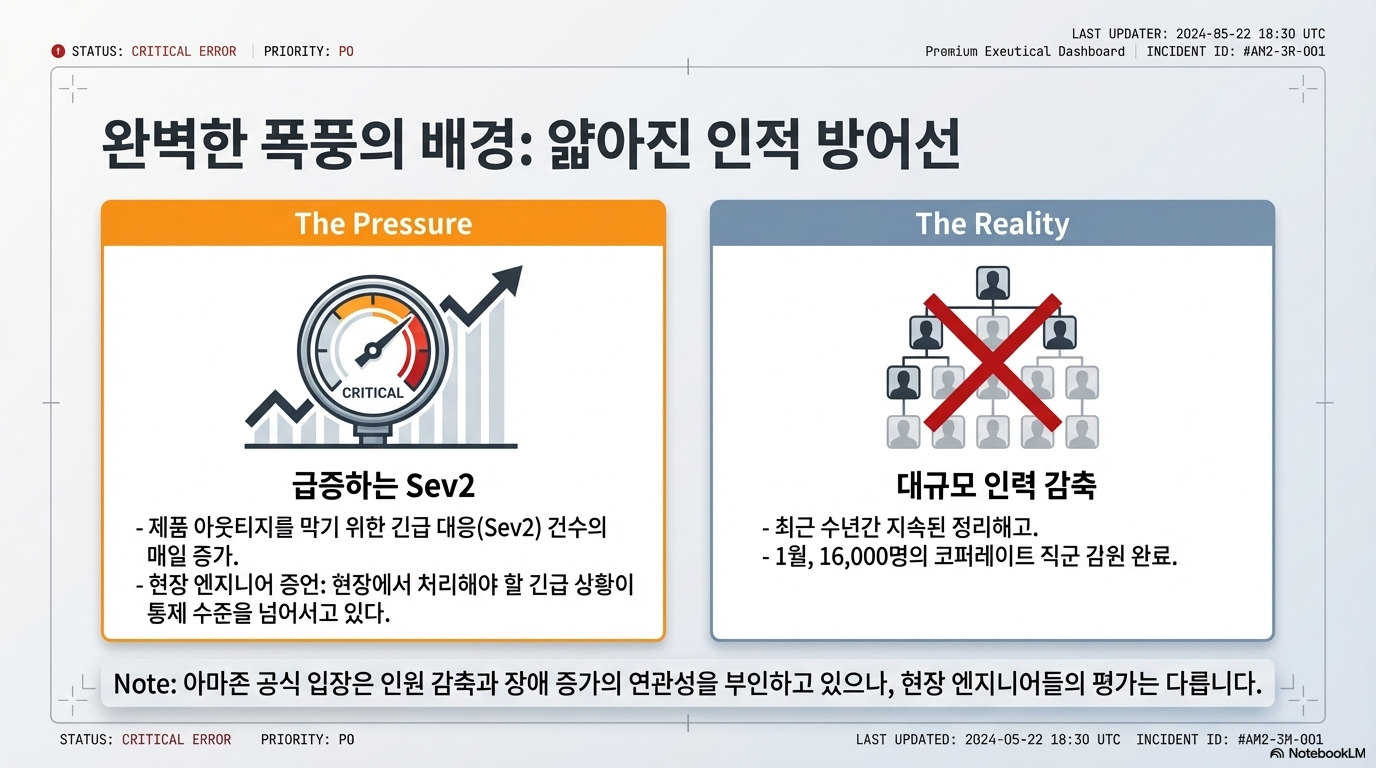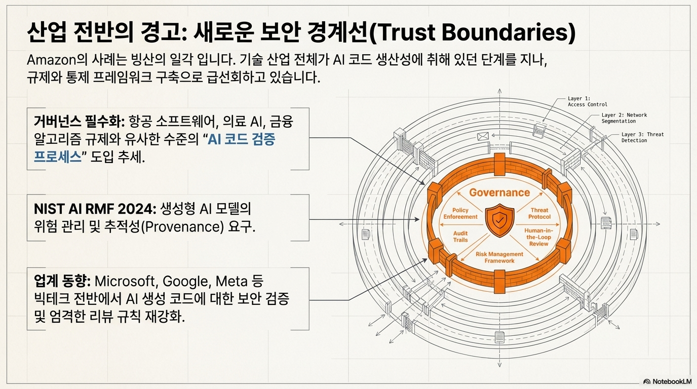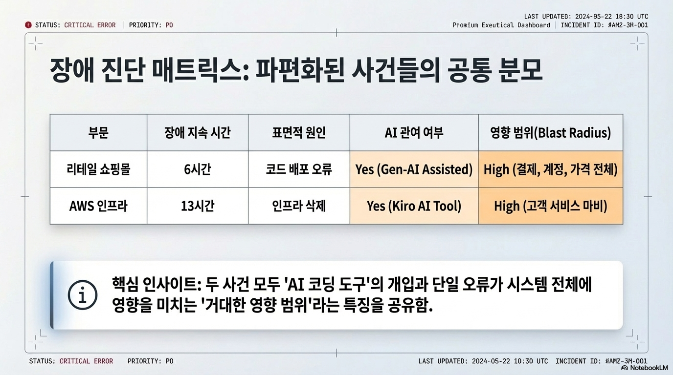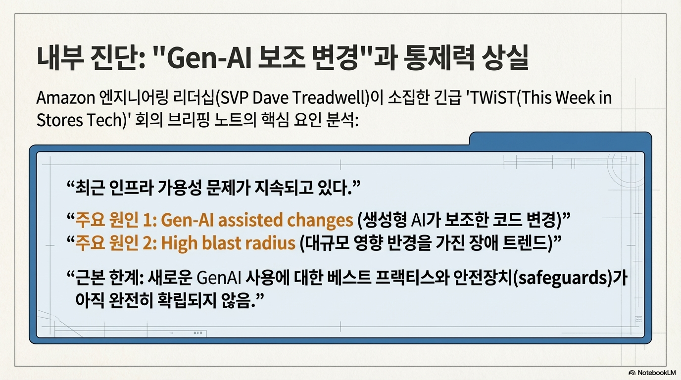 최근 Amazon은 여러 차례의 서비스 장애(outage)를 겪었으며, 일부 장애는 생성형 AI가 생성하거나 수정한 코드 변경(Gen-AI assisted changes)과 관련된 것으로 분석되었다. 이 사건 이후 Amazon은 AI가 관여한 코드 변경은 반드시 시니어 엔지니어가 검토(sign-off)하도록 하는 정책을 도입하기로 했다.