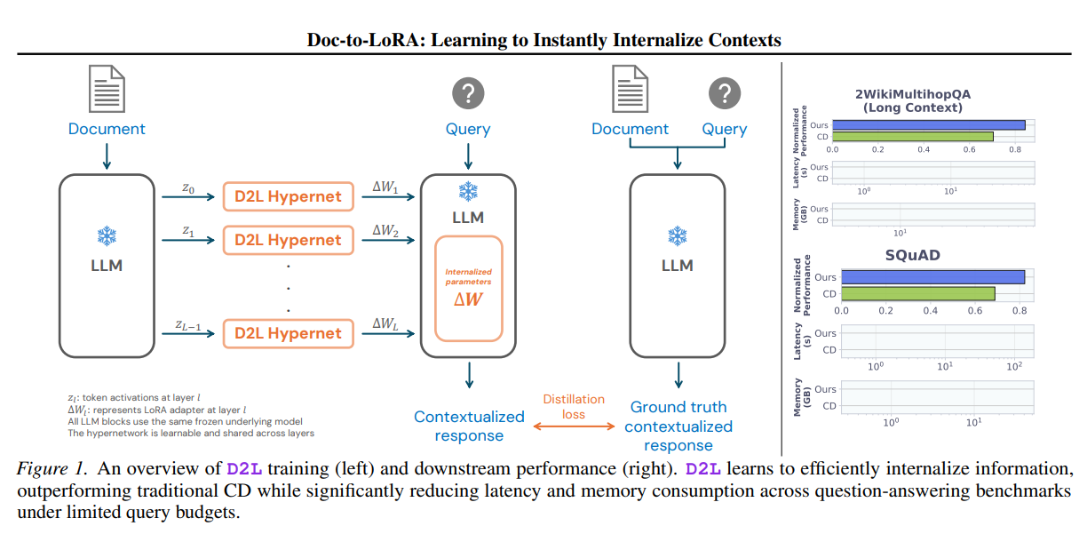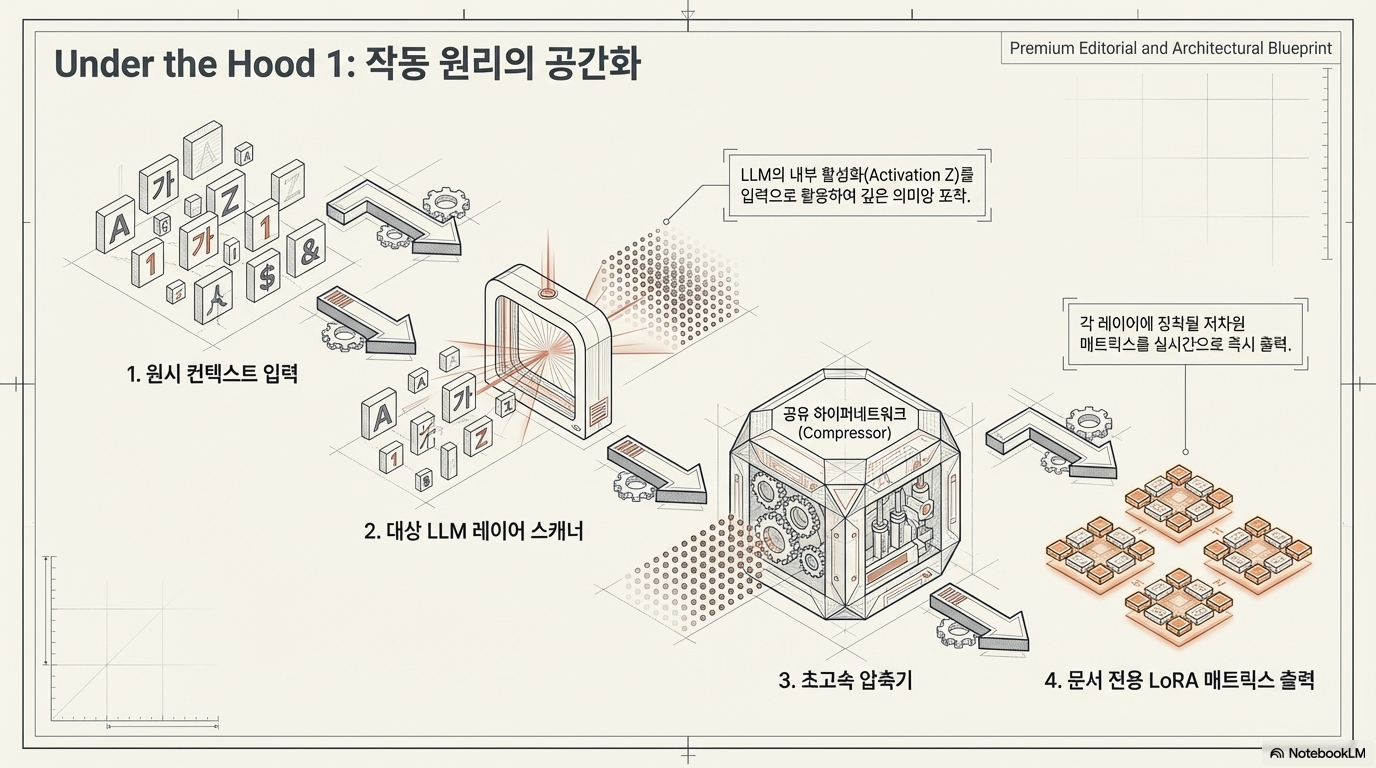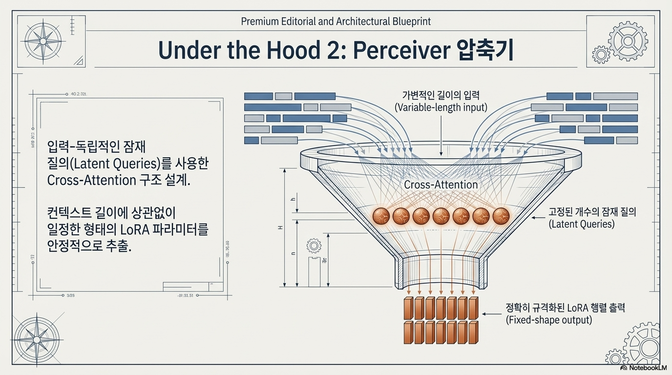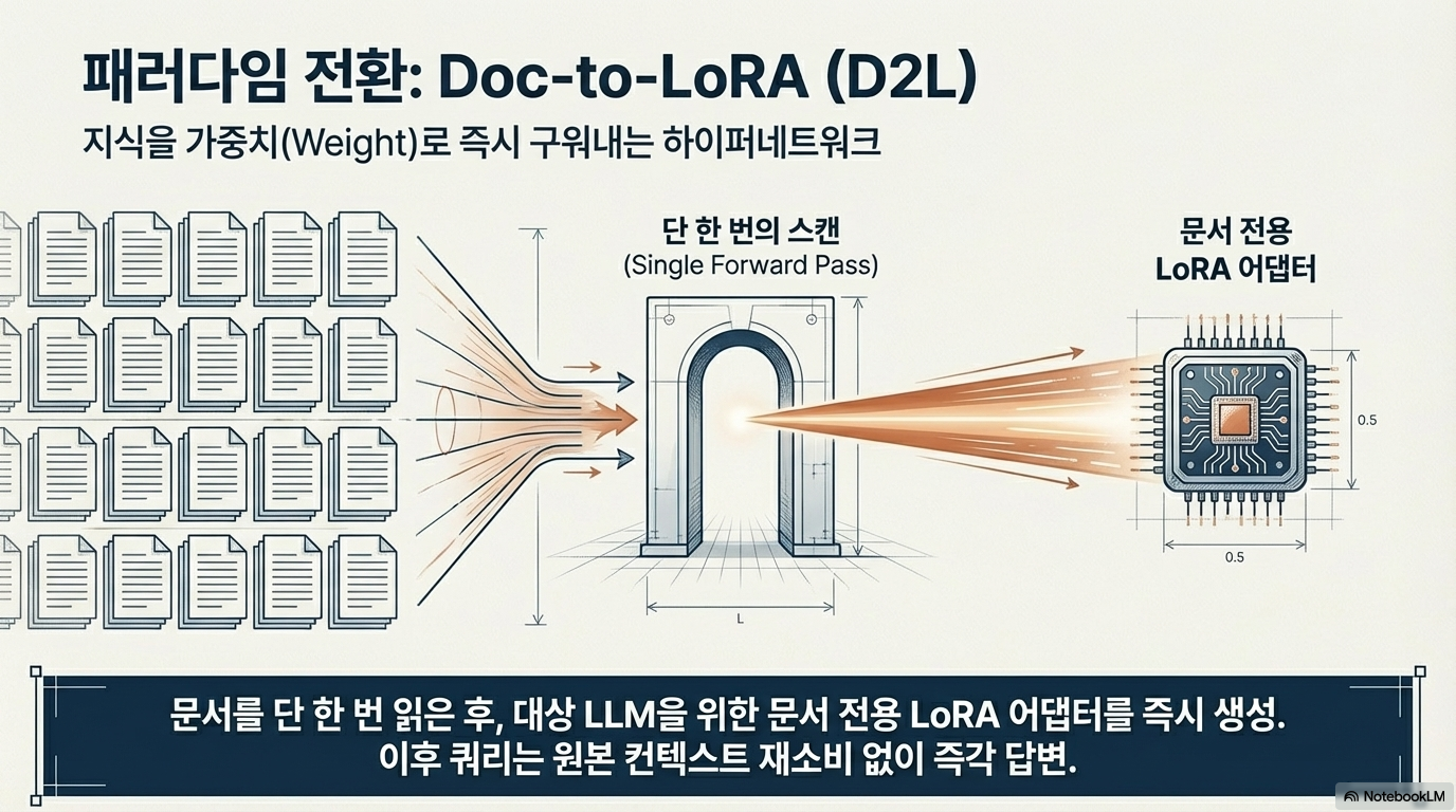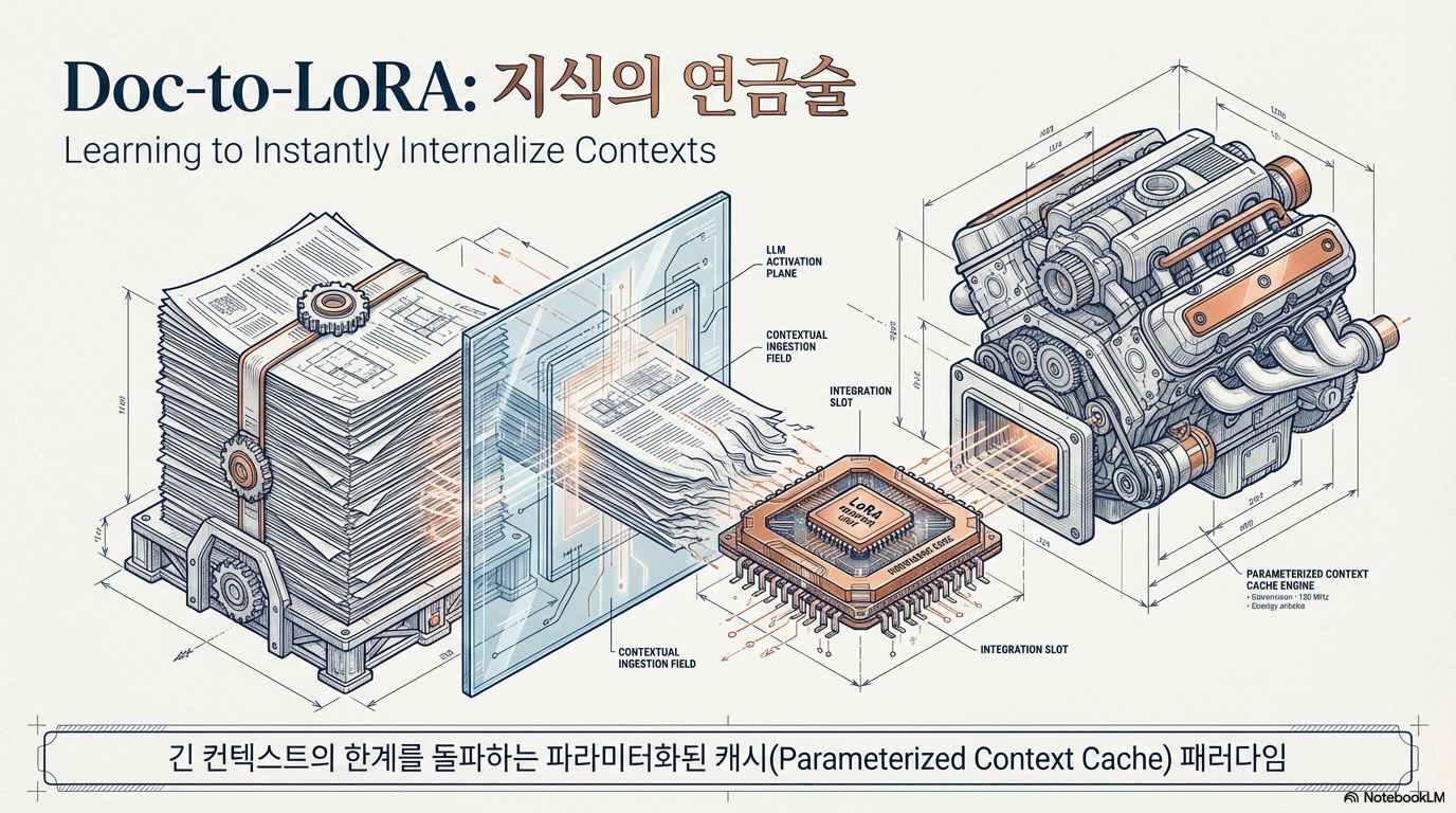 이 연구는 대규모 언어 모델(LLM)이 긴 문맥을 처리할 때 발생하는 연산 비용과 메모리 병목 현상을 해결하기 위해 Doc-to-LoRA(D2L)라는 혁신적인 기법을 제안합니다. D2L은 가벼운 하이퍼네트워크를 활용하여 방대한 문서를 단 한 번의 순전파만으로 즉각적으로 모델 파라미터 내부에 내재화하며, 이를 통해 기존의 느린 문맥 증류 과정을 획기적으로 가속합니다. 이 시스템은 입력된 정보를 LoRA 어댑터 형태로 변환하여 모델에 장착함으로써, 이후의 질의에 대해 원래의 긴 문맥이나 KV 캐시 없이도 지연 시간과 메모리 점유율을 대폭 낮춘 채 정확한 답변을 제공합니다. 특히 청킹 메커니즘과 Perceiver 기반 구조를 도입하여 학습 단위를 넘어서는 초장거리 문맥에서도 뛰어난 성능을 유지하며, 텍스트를 넘어 시각적 정보까지 모델에 주입할 수 있는 강력한 제로샷 일반화 능력을 입증했습니다. 결국 이 기술은 LLM이 실시간으로 새로운 지식을 습득하고 개인화된 대화를 수행할 수 있도록 돕는 효율적이고 우아한 모델 적응 프레임워크를 구축하는 데 목적이 있습니다.