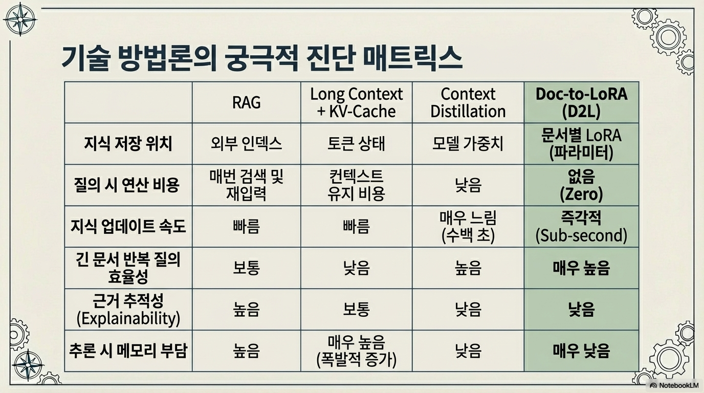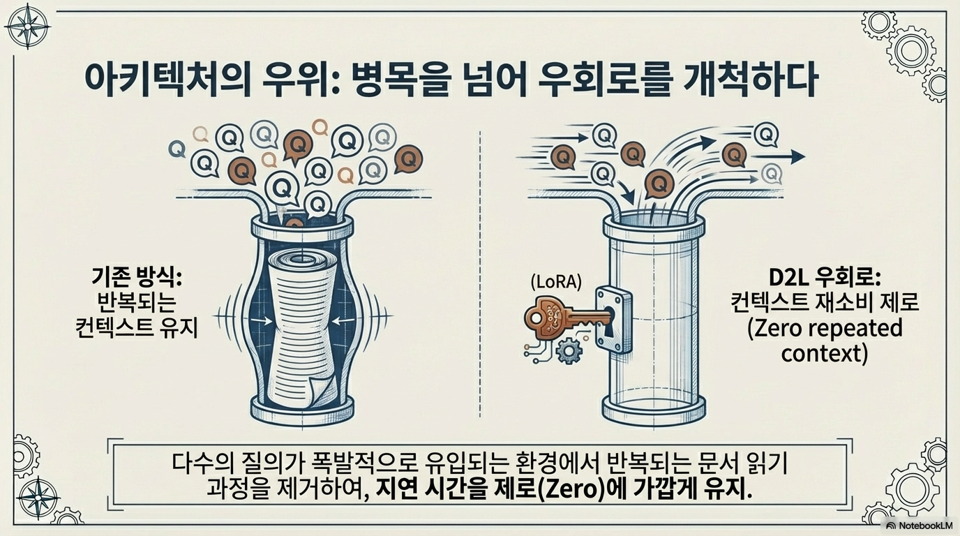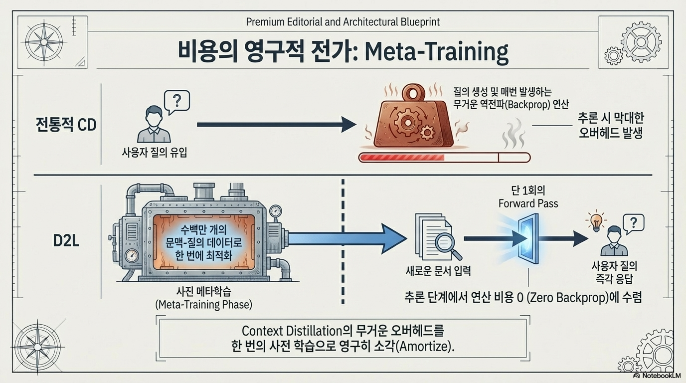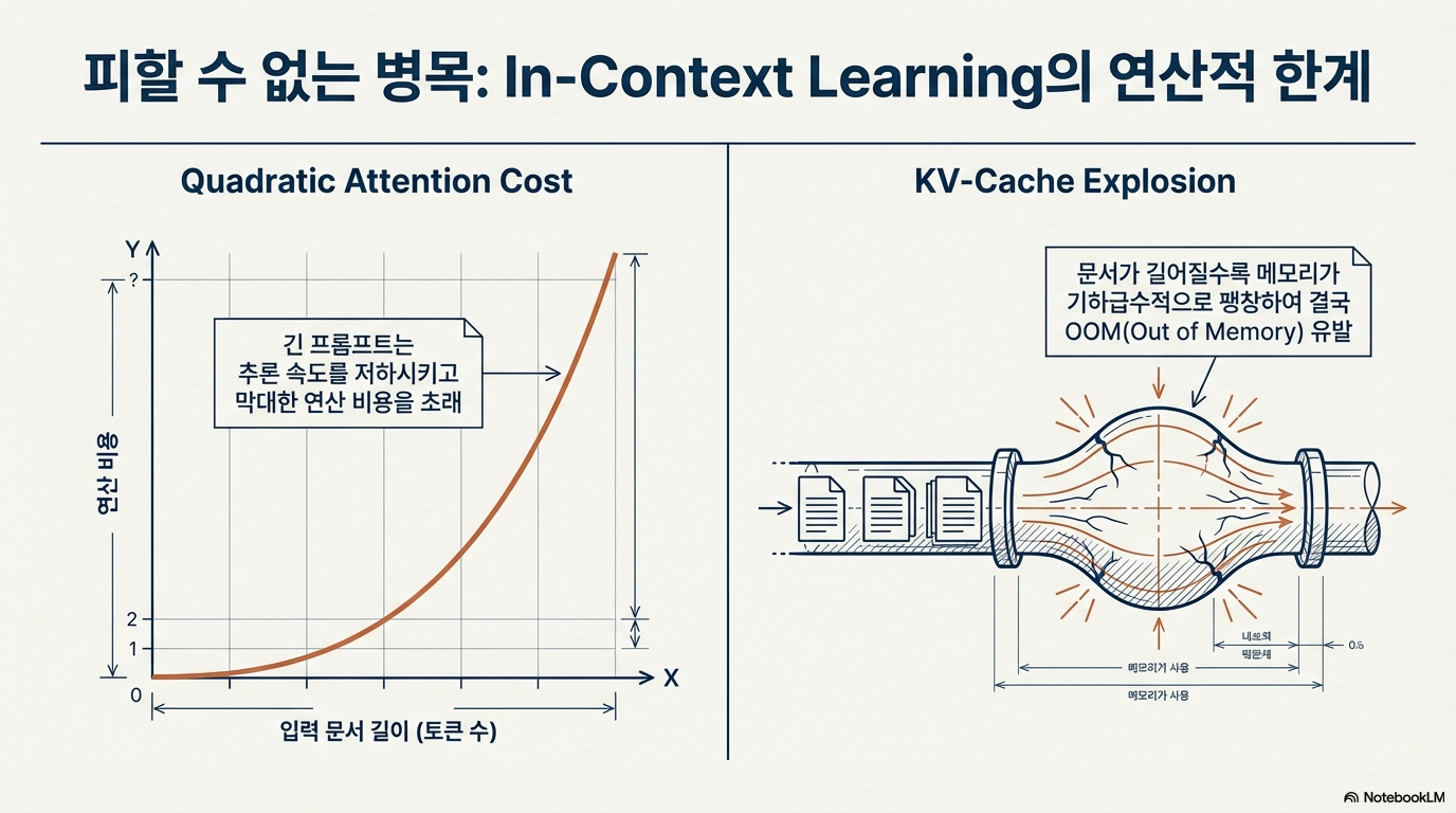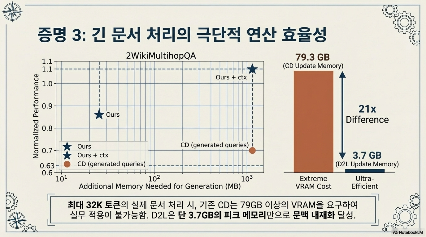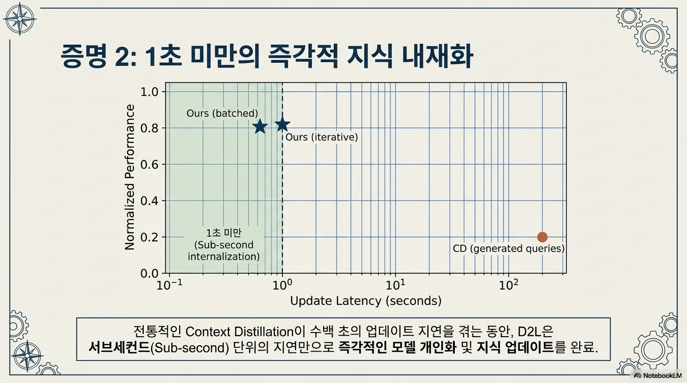 이 연구는 대규모 언어 모델(LLM)이 긴 문맥을 처리할 때 발생하는 연산 비용과 메모리 병목 현상을 해결하기 위해 Doc-to-LoRA(D2L)라는 혁신적인 기법을 제안합니다. D2L은 가벼운 하이퍼네트워크를 활용하여 방대한 문서를 단 한 번의 순전파만으로 즉각적으로 모델 파라미터 내부에 내재화하며, 이를 통해 기존의 느린 문맥 증류 과정을 획기적으로 가속합니다. 이 시스템은 입력된 정보를 LoRA 어댑터 형태로 변환하여 모델에 장착함으로써, 이후의 질의에 대해 원래의 긴 문맥이나 KV 캐시 없이도 지연 시간과 메모리 점유율을 대폭 낮춘 채 정확한 답변을 제공합니다. 특히 청킹 메커니즘과 Perceiver 기반 구조를 도입하여 학습 단위를 넘어서는 초장거리 문맥에서도 뛰어난 성능을 유지하며, 텍스트를 넘어 시각적 정보까지 모델에 주입할 수 있는 강력한 제로샷 일반화 능력을 입증했습니다. 결국 이 기술은 LLM이 실시간으로 새로운 지식을 습득하고 개인화된 대화를 수행할 수 있도록 돕는 효율적이고 우아한 모델 적응 프레임워크를 구축하는 데 목적이 있습니다.