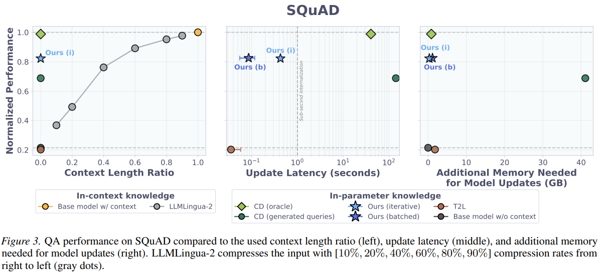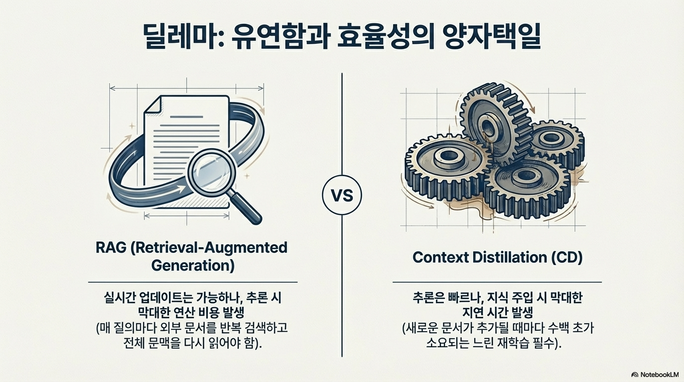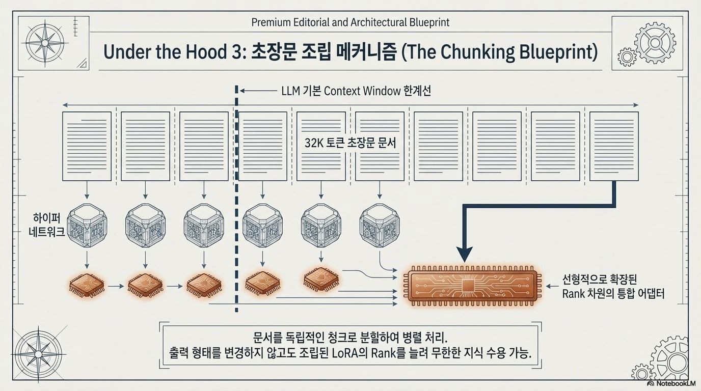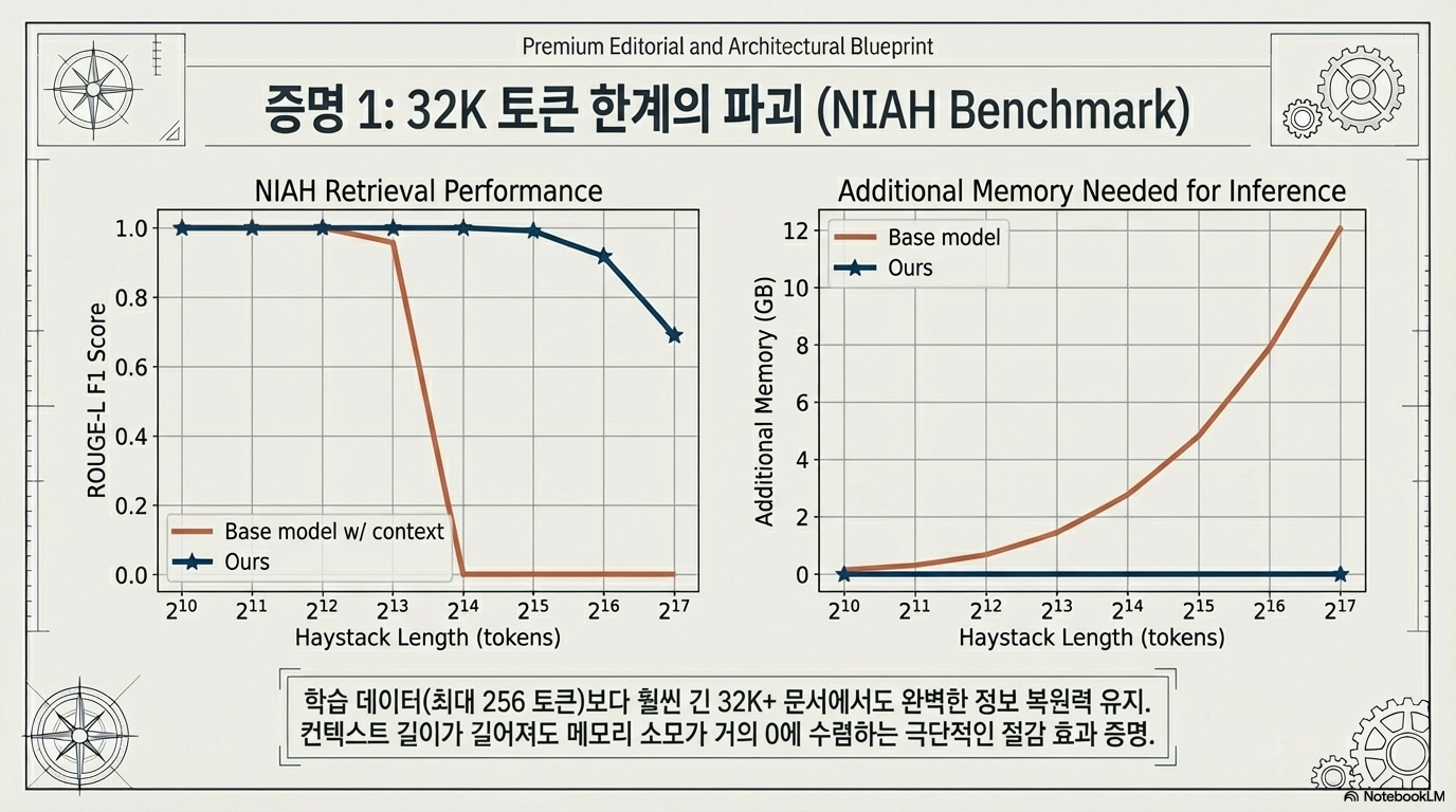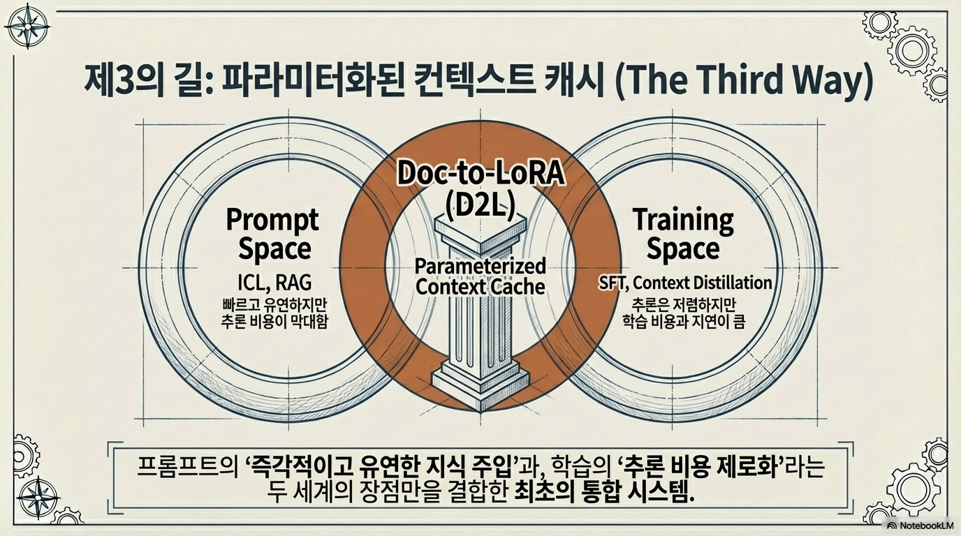 이 연구는 대규모 언어 모델(LLM)이 긴 문맥을 처리할 때 발생하는 연산 비용과 메모리 병목 현상을 해결하기 위해 Doc-to-LoRA(D2L)라는 혁신적인 기법을 제안합니다. D2L은 가벼운 하이퍼네트워크를 활용하여 방대한 문서를 단 한 번의 순전파만으로 즉각적으로 모델 파라미터 내부에 내재화하며, 이를 통해 기존의 느린 문맥 증류 과정을 획기적으로 가속합니다. 이 시스템은 입력된 정보를 LoRA 어댑터 형태로 변환하여 모델에 장착함으로써, 이후의 질의에 대해 원래의 긴 문맥이나 KV 캐시 없이도 지연 시간과 메모리 점유율을 대폭 낮춘 채 정확한 답변을 제공합니다. 특히 청킹 메커니즘과 Perceiver 기반 구조를 도입하여 학습 단위를 넘어서는 초장거리 문맥에서도 뛰어난 성능을 유지하며, 텍스트를 넘어 시각적 정보까지 모델에 주입할 수 있는 강력한 제로샷 일반화 능력을 입증했습니다. 결국 이 기술은 LLM이 실시간으로 새로운 지식을 습득하고 개인화된 대화를 수행할 수 있도록 돕는 효율적이고 우아한 모델 적응 프레임워크를 구축하는 데 목적이 있습니다.