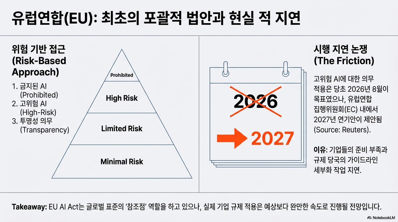 (빅테크 기업들의 반발에 따라 EU는 '고위험' AI 규제 도입을 2027년까지 연기하기로 했습니다.)