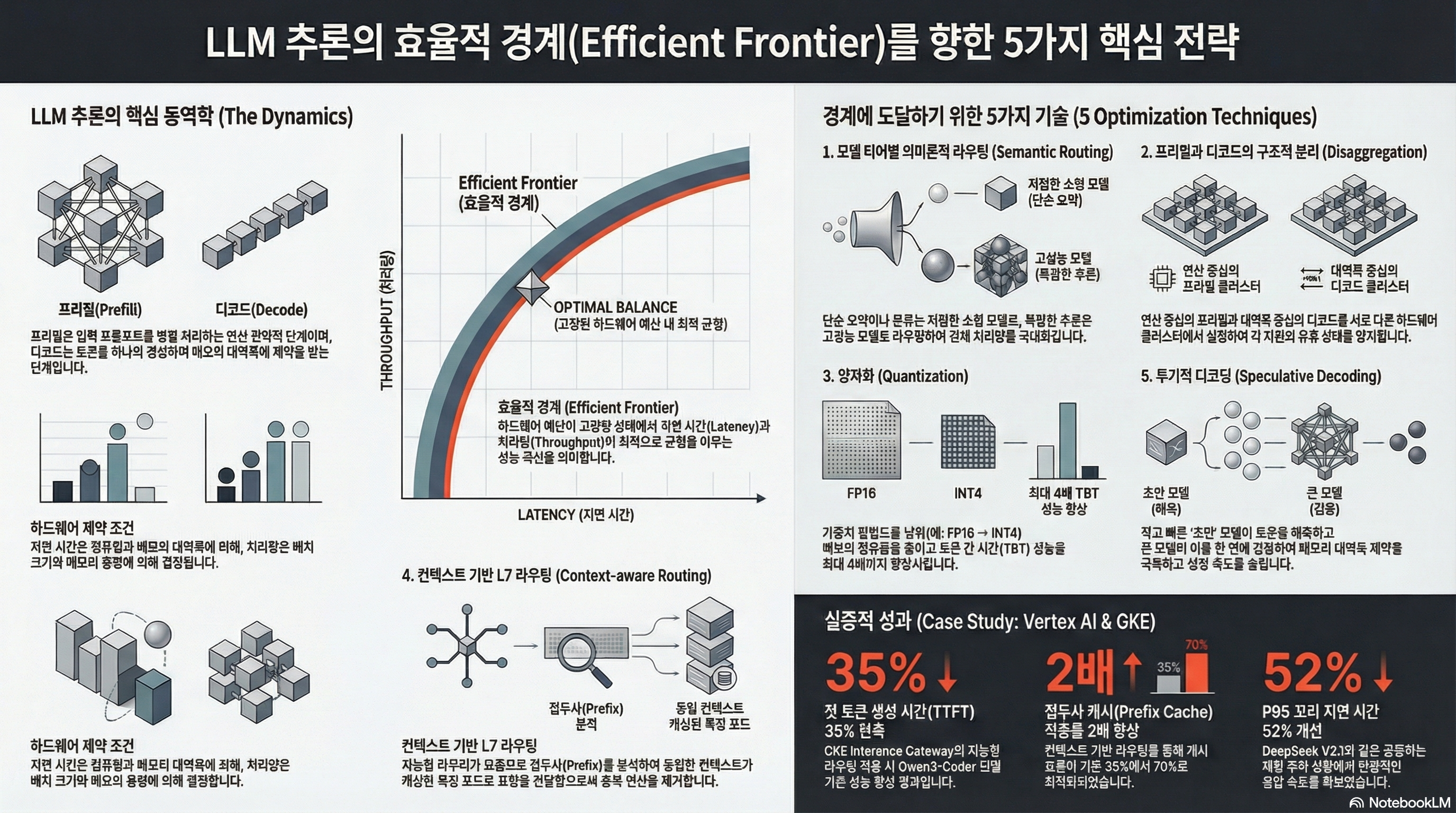 한정된 하드웨어 예산 내에서 지연 시간과 처리량 사이의 최적 균형점을 뜻하는 효율적 경계(efficient frontier)에 도달하기 위한 LLM 추론 최적화 전략을 다룹니다. 저자는 성능을 극대화하기 위해 시맨틱 라우팅, 사전 채우기와 디코딩의 분리, 양자화, 컨텍스트 인식 라우팅, 그리고 투기적 디코딩이라는 다섯 가지 핵심 기술을 제안합니다. 특히 네트워크 계층에서의 지능형 라우팅이 중복 계산을 방지하여 효율성을 대폭 높일 수 있음을 강조하며, 실제 사례를 통해 그 효과를 입증합니다. 궁극적으로 이 글은 끊임없이 진화하는 기술 환경에 맞춰 유연한 인프라를 구축함으로써 추론 경제성을 확보하고 최적의 성능을 유지해야 한다는 실무적인 지침을 제공합니다.