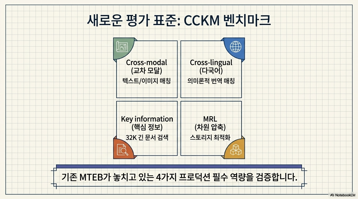 이 자료는 2026년 기준 RAG(검색 증강 생성) 시스템의 성능을 극대화하기 위해 설계된 CCKM 벤치마크를 바탕으로 10가지 주요 임베딩 모델을 심층 분석하고 있습니다. 기존 지표인 MTEB가 다루지 못하는 교차 모달리티, 다국어 정렬, 장문 내 핵심 정보 추출, 그리고 차원 압축 효율성이라는 네 가지 실무적 관점을 중심으로 각 모델의 기술적 우위를 대조합니다. 분석 결과 Gemini Embedding 2가 전반적인 성능이 가장 뛰어난 올라운더로 꼽혔으며, 오픈소스 모델인 Qwen3-VL-2B는 이미지와 텍스트를 잇는 교차 검색에서 유료 API를 능가하는 성과를 보였습니다. 궁극적으로 이 텍스트는 개발자가 자신의 데이터 특성과 저장 비용 예산에 맞춰 최적의 모델을 선택할 수 있는 전략적 의사결정 가이드를 제공하는 데 목적이 있습니다.