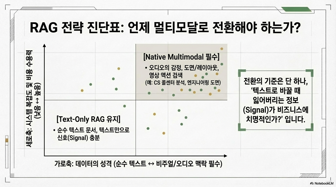텍스트를 넘어 이미지, 오디오, 비디오를 데이터의 본래 형태 그대로 처리하는 멀티모달 임베딩과 RAG(검색 증강 생성) 시스템의 혁신적인 활용법을 소개합니다. 저자는 기존의 텍스트 변환 방식이 데이터 고유의 맥락과 질감을 손실시킨다고 지적하며, 서로 다른 매체를 공통된 벡터 공간에 매핑하여 형식에 구애받지 않고 정보를 검색하는 원리를 설명합니다. 특히 대조 학습을 통해 모델이 다양한 데이터 간의 의미적 연관성을 학습하는 과정을 다루고, 효과적인 시스템 구축을 위한 청킹 전략과 차원 최적화 등 실무적인 설계 지침을 제시합니다. 구체적으로는 대본 없는 오디오 검색, 시각적 레이아웃을 보존한 PDF 분석, 비디오 내 특정 장면 탐색이라는 세 가지 실무 사례를 통해 멀티모달 기술이 실제 문제 해결에 기여하는 방식을 구체화합니다. 결론적으로 이 텍스트는 데이터의 원형을 유지하면서도 정교한 의미 기반 검색을 구현하려는 개발자들을 위한 포괄적인 실용 가이드 역할을 수행합니다.