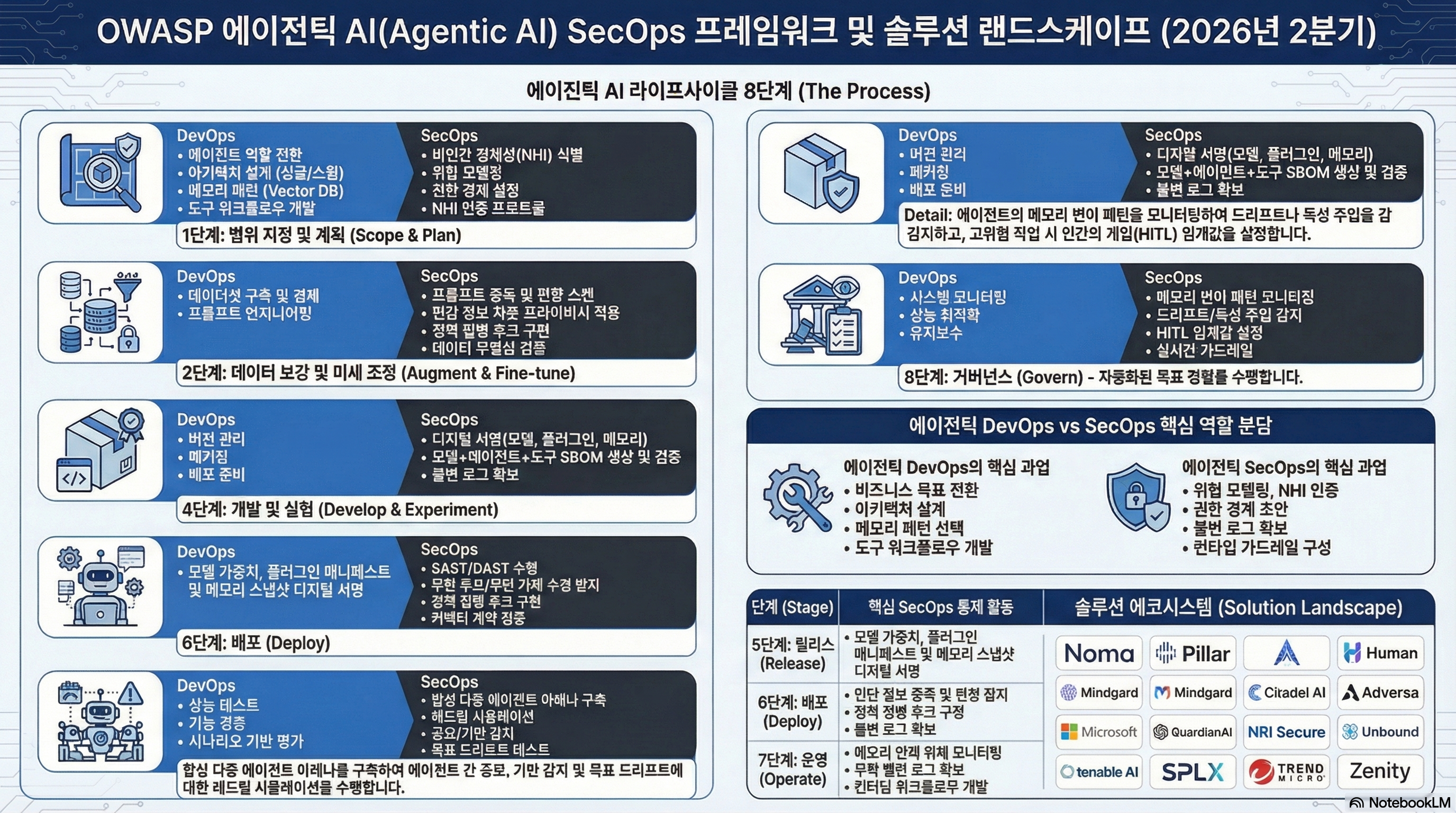 이 자료는 OWASP GenAI 보안 프로젝트에서 발표한 에이전틱 AI 보안 솔루션 환경에 대한 가이드라인을 다루고 있습니다. 핵심 내용은 자율적인 멀티 에이전트 시스템으로 진화하는 AI 기술에 맞춰 DevOps와 SecOps의 협력 모델을 재정의하는 것입니다. 기획부터 운영에 이르는 전체 수명 주기 동안 발생할 수 있는 목표 이탈, 데이터 오염, 권한 남용과 같은 위협을 차단하기 위한 구체적인 대응 전략을 제시합니다. 특히 18개 이상의 주요 보안 솔루션 기업들이 참여하여 보안 위협 분류 체계와 완화 정책을 실제 제품에 구현한 사례를 소개합니다. 이를 통해 기업들이 고도화된 AI 환경에서도 신뢰성과 가시성을 확보하며 안전하게 시스템을 구축할 수 있도록 돕습니다.