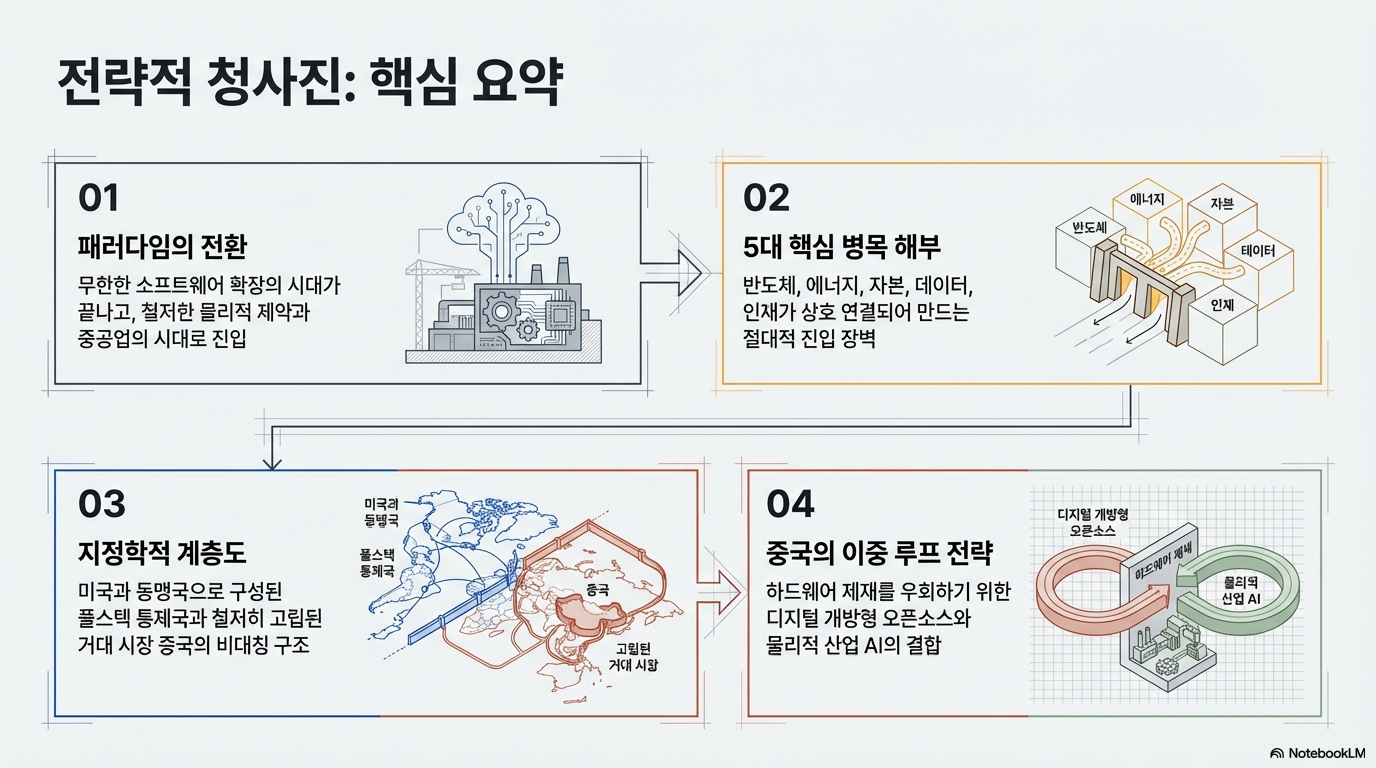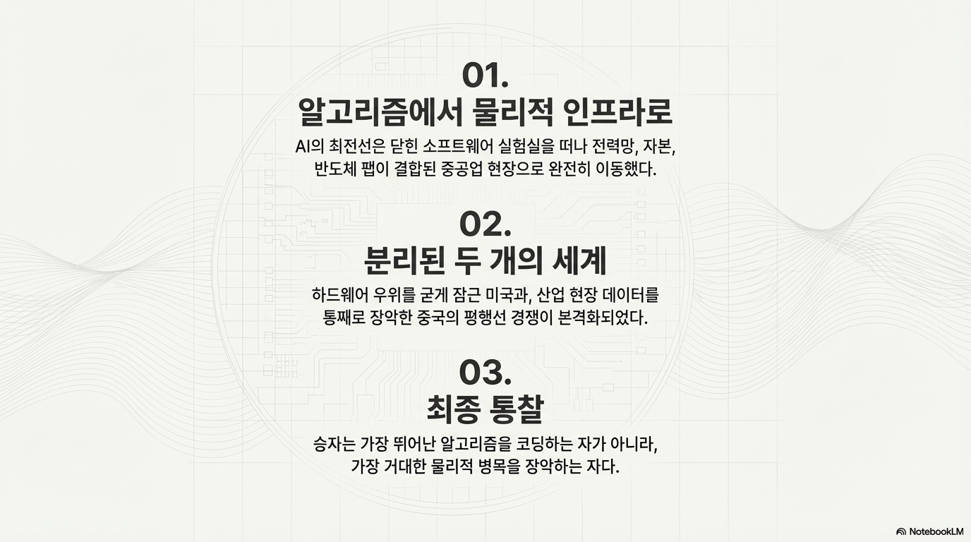 인공지능 기술이 단순한 소프트웨어 혁신을 넘어 에너지, 반도체, 인재, 자본이 결합된 지정학적 패권 경쟁으로 진화했음을 분석합니다. AI 발전의 핵심 동력은 이제 알고리즘의 효율성보다는 고성능 칩의 공급망 통제와 막대한 전력 인프라 확보 같은 물리적 자원에 의해 결정됩니다. 특히 미국과 중국 사이의 기술 격차는 반도체 수출 통제와 자본 투입량의 차이로 인해 더욱 고착화되는 양상을 보입니다. 한편으로는 헬륨 공급 부족이나 데이터센터 증설 한계와 같은 예기치 못한 병목 현상들이 글로벌 AI 산업의 확장 속도를 제약하는 변수로 작용하고 있습니다. 결국 미래의 AI 주도권은 혁신적인 모델 개발 능력을 넘어, 이러한 **복합적인 공급망 chokepoint(병목 지점)**를 얼마나 안정적으로 관리하고 통제하느냐에 달려 있습니다. 요약하자면 AI는 이제 순수 기술의 영역을 벗어나 국가 전략과 산업 자원이 얽힌 거대한 지정학적 산업으로 재정의되고 있습니다.