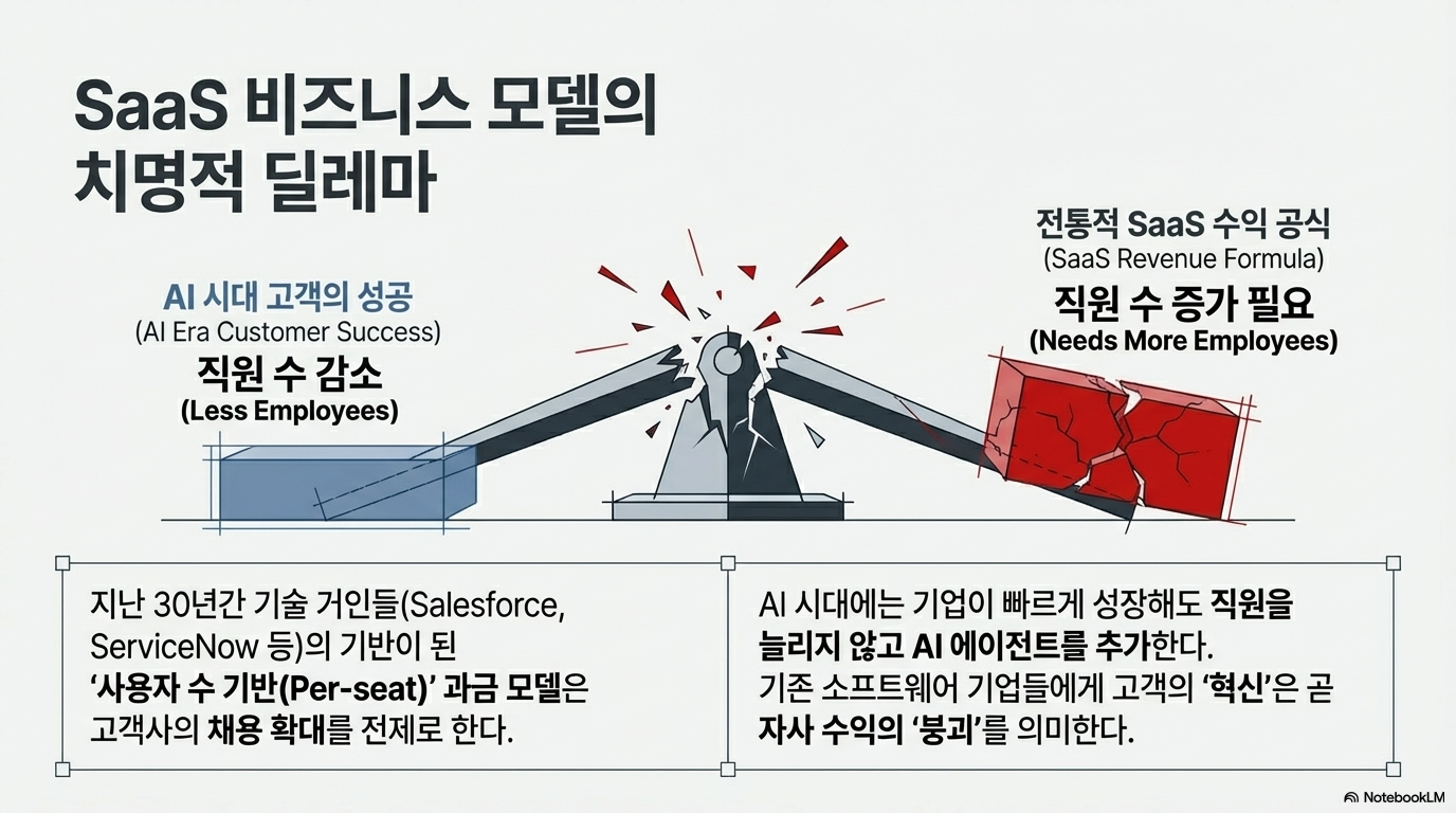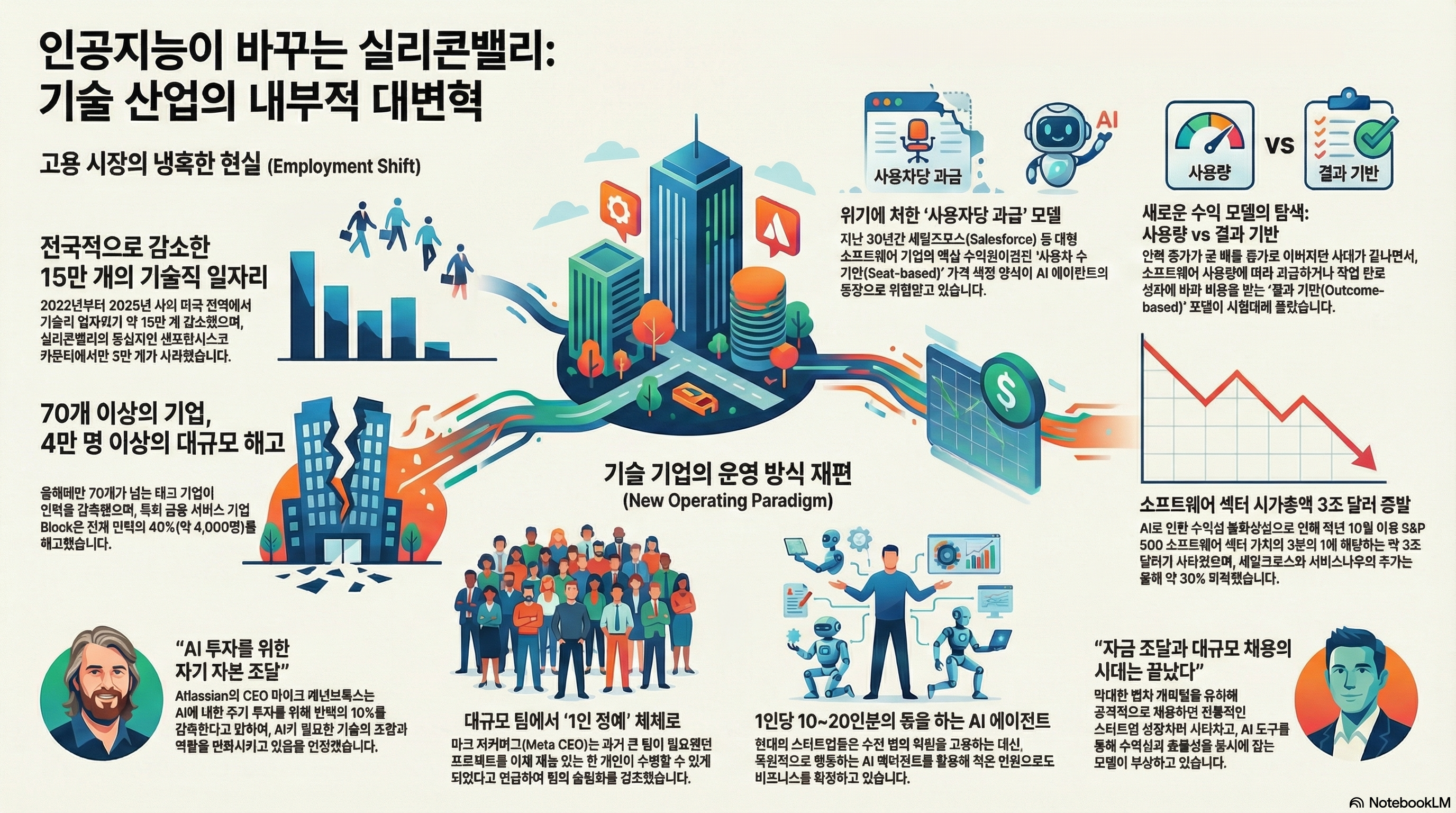 인공지능이 사회 전반에 미칠 파장보다 실리콘밸리 자체의 구조적 변혁에 더 먼저, 그리고 강력하게 작용하고 있음을 조명합니다. 과거에는 여러 전문직의 위기를 예견했으나, 현재는 오히려 기술 기업들이 A.I.를 활용한 인력 감축과 조직의 효율화를 주도하며 스스로의 형태를 바꾸고 있습니다. 특히 코딩 능력의 비약적 발전은 적은 인원으로도 큰 성과를 내는 소규모 팀 위주의 기업 모델을 가능케 했으며, 이는 기존의 고용 중심 성장을 뒤흔들고 있습니다. 더불어 사용 인원수에 비례해 비용을 받던 전통적인 수익 구조가 붕괴되면서, 테크 산업은 불확실한 미래에 대응하기 위한 거대한 실험의 장이 되었습니다. 결과적으로 이 텍스트는 인공지능이 단순히 도구에 그치지 않고, 기술 업계의 고용, 경영 방식, 시장 가치를 근본적으로 재편하고 있음을 강조합니다.