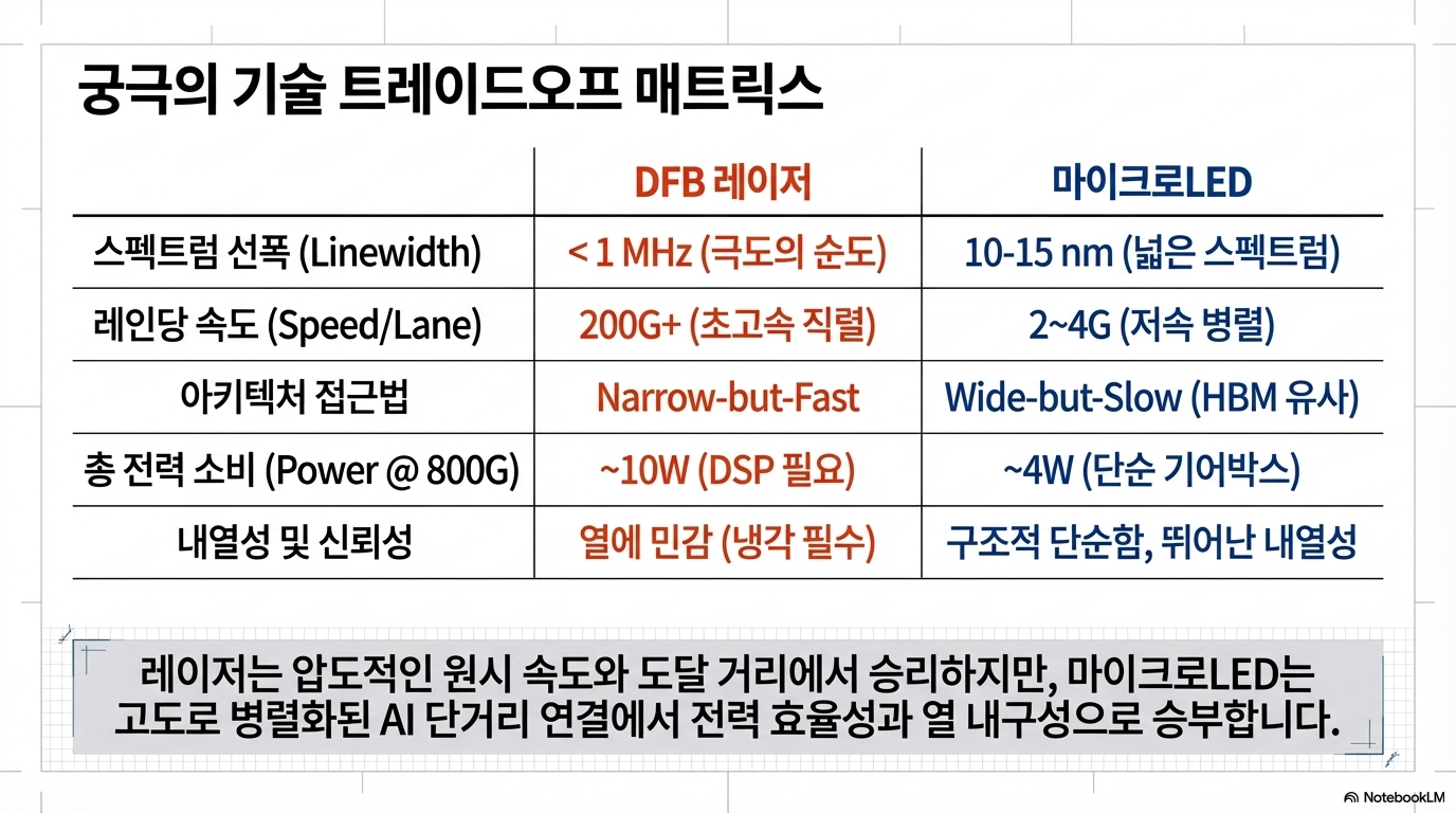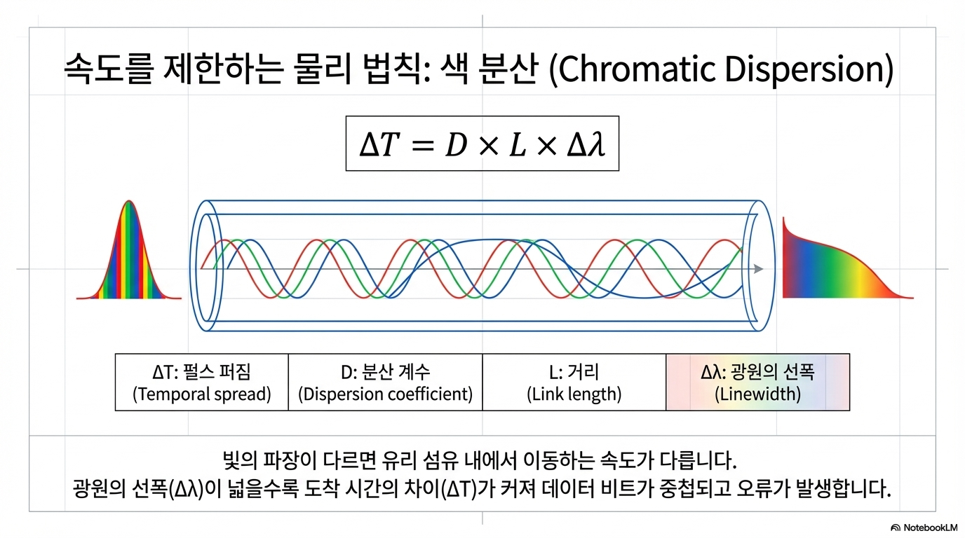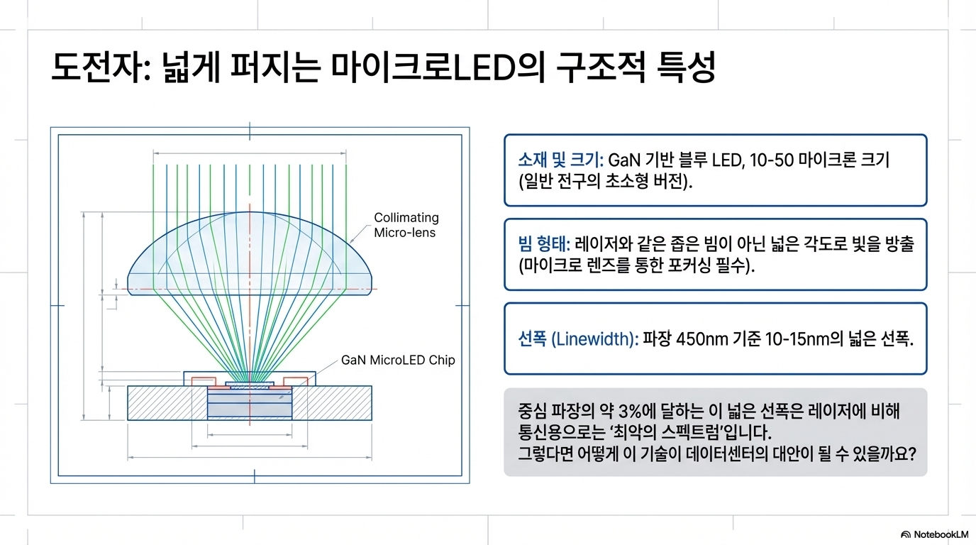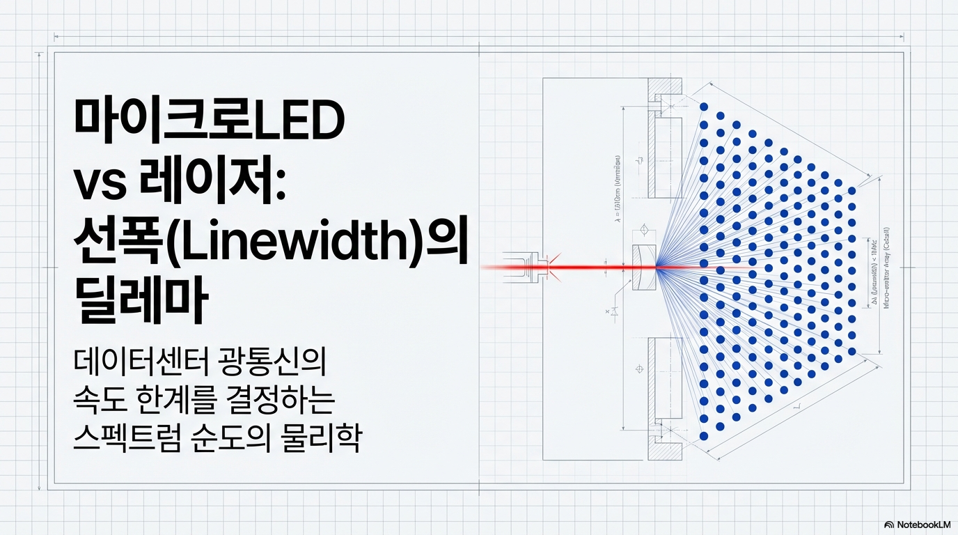 이 문서는 데이터센터의 광학 연결 기술인 레이저(Laser)와 마이크로LED(MicroLED)의 핵심적인 차이와 상충 관계를 선폭(Linewidth)이라는 개념을 통해 설명합니다. 기존의 분포 귀환형(DFB) 레이저는 매우 좁은 선폭을 가져 데이터 전송 속도가 빠르고 장거리 통신에 유리하지만, 마이크로LED는 선폭이 넓어 단일 채널 속도는 느린 대신 저전력 및 고신뢰성을 바탕으로 한 병렬 전송 방식에서 강점을 보입니다. 특히 빛의 색 분산(Chromatic Dispersion) 현상으로 인해 광원의 순도가 데이터 처리 한계를 결정한다는 물리적 원리를 구체적인 수식과 함께 제시하고 있습니다. 결론적으로 이 글은 마이크로LED가 레이저를 완전히 대체하기보다는 단거리 인터커넥트 분야에서 효율적인 대안이 될 수 있음을 시사하며 최신 기술 트렌드를 분석합니다.