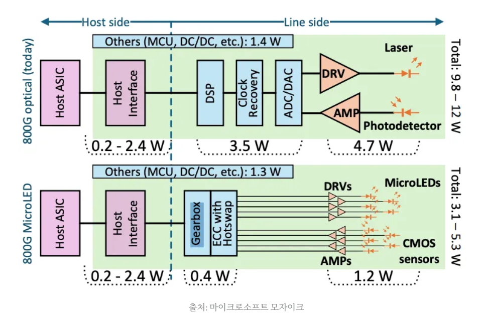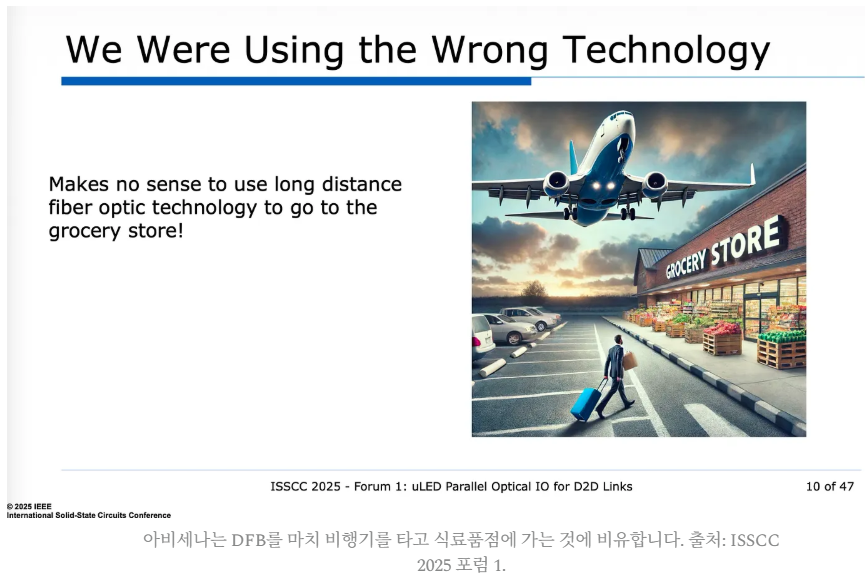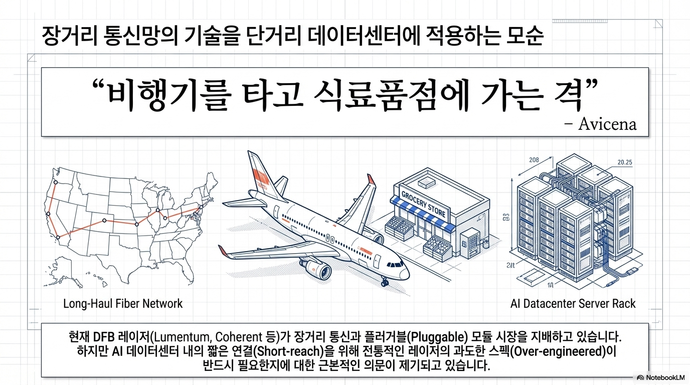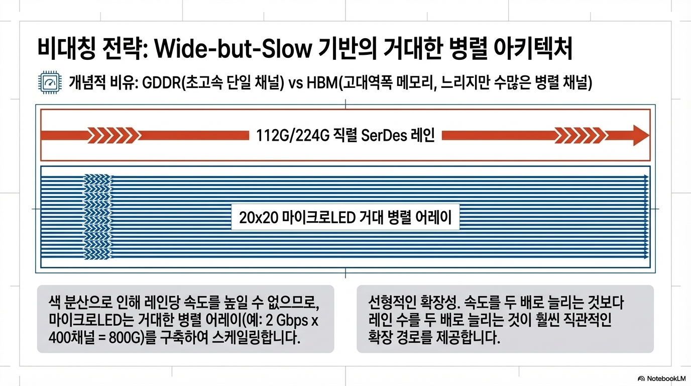 이 문서는 데이터센터의 광학 연결 기술인 레이저(Laser)와 마이크로LED(MicroLED)의 핵심적인 차이와 상충 관계를 선폭(Linewidth)이라는 개념을 통해 설명합니다. 기존의 분포 귀환형(DFB) 레이저는 매우 좁은 선폭을 가져 데이터 전송 속도가 빠르고 장거리 통신에 유리하지만, 마이크로LED는 선폭이 넓어 단일 채널 속도는 느린 대신 저전력 및 고신뢰성을 바탕으로 한 병렬 전송 방식에서 강점을 보입니다. 특히 빛의 색 분산(Chromatic Dispersion) 현상으로 인해 광원의 순도가 데이터 처리 한계를 결정한다는 물리적 원리를 구체적인 수식과 함께 제시하고 있습니다. 결론적으로 이 글은 마이크로LED가 레이저를 완전히 대체하기보다는 단거리 인터커넥트 분야에서 효율적인 대안이 될 수 있음을 시사하며 최신 기술 트렌드를 분석합니다.
