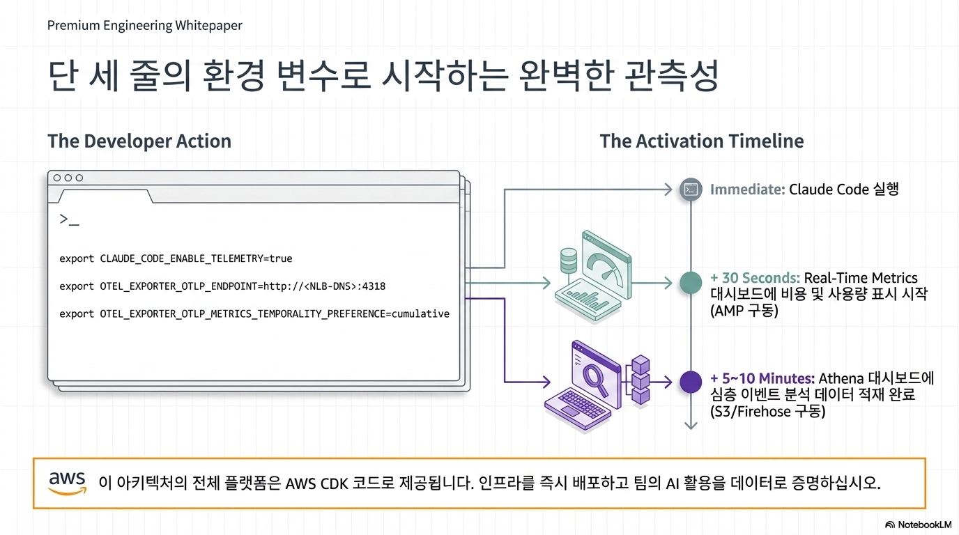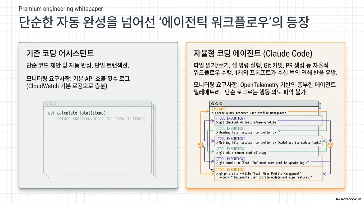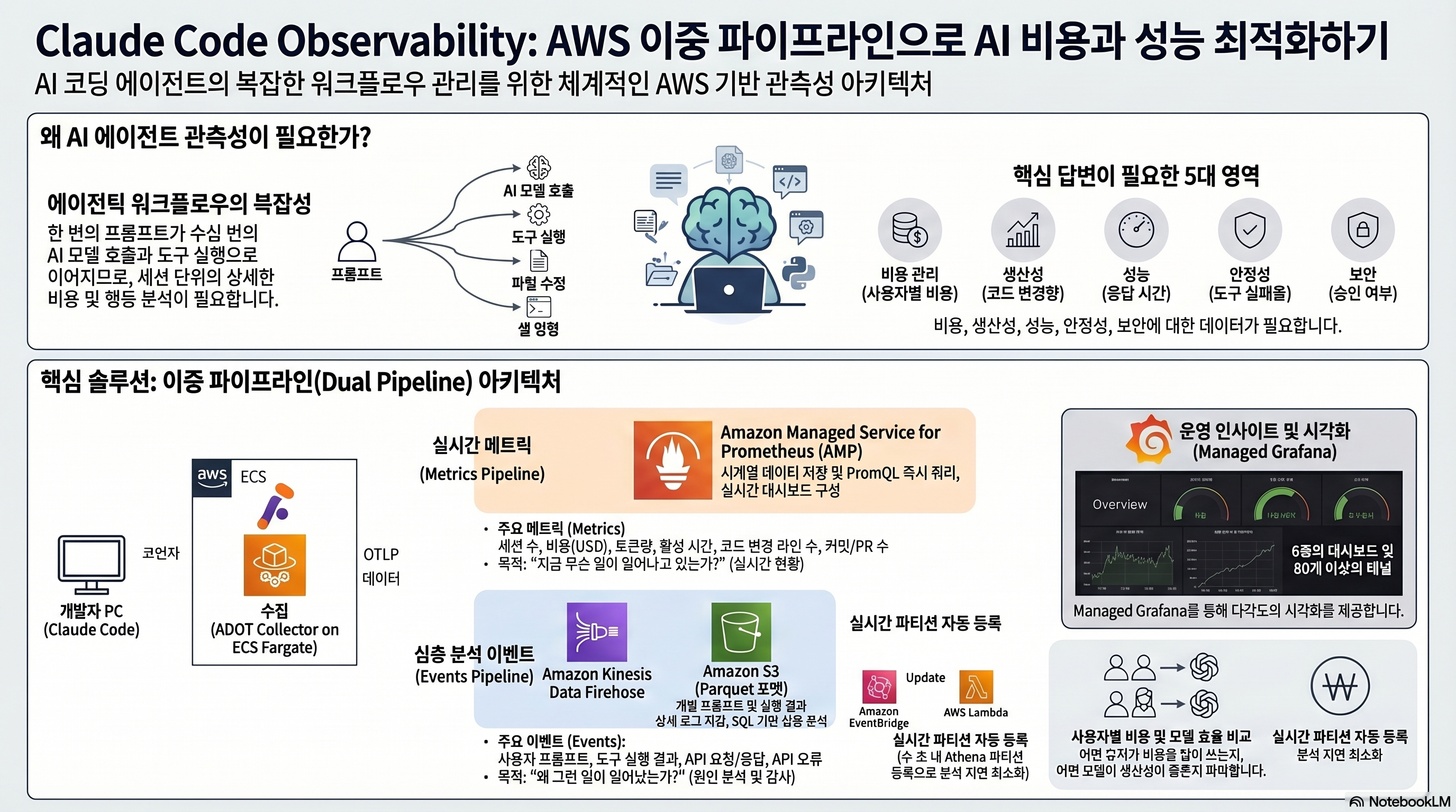 기업이 AI 코딩 에이전트인 Claude Code의 운영 현황을 체계적으로 관리할 수 있도록 AWS 기반의 관측성(Observability) 플랫폼을 구축하는 기술 가이드를 제시합니다. 핵심 전략은 실시간 지표를 수집하는 메트릭 파이프라인과 상세 내역을 분석하는 이벤트 파이프라인을 분리하여 운영 효율성을 극대화하는 이중 아키텍처 설계에 있습니다. 이를 통해 조직은 AI 도구 사용에 따른 사용자별 비용 추적, 모델의 생산성 기여도, 도구 실행의 안정성과 같은 비즈니스 핵심 질문에 명확한 데이터 기반의 해답을 얻을 수 있습니다. 결과적으로 이 솔루션은 단순한 모니터링을 넘어 AI 도입 효과를 정량적으로 증명하고 최적의 운영 통찰력을 제공하는 것을 목적으로 합니다.