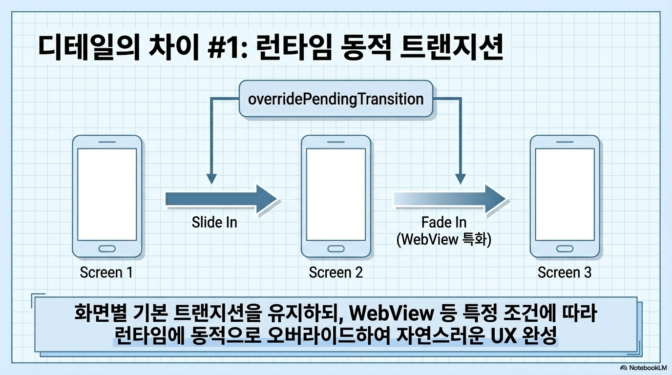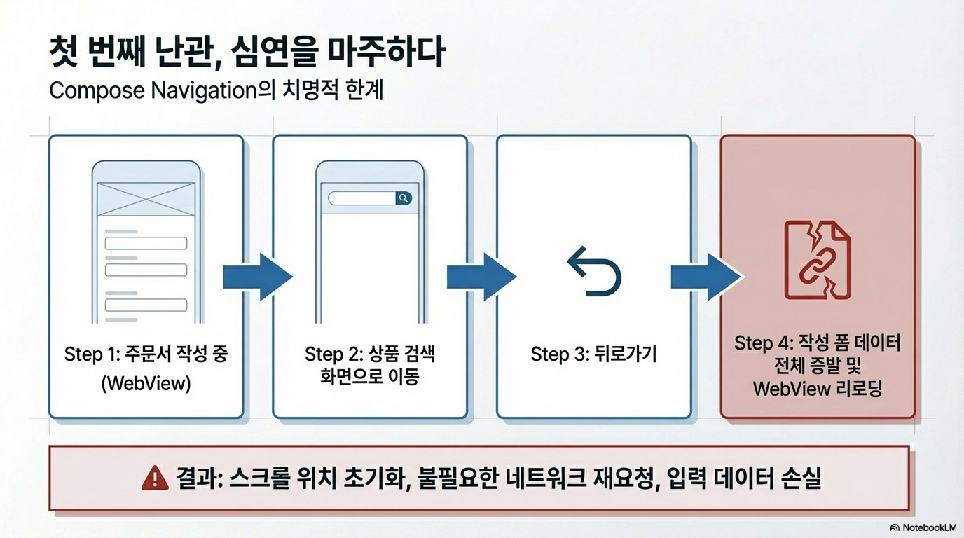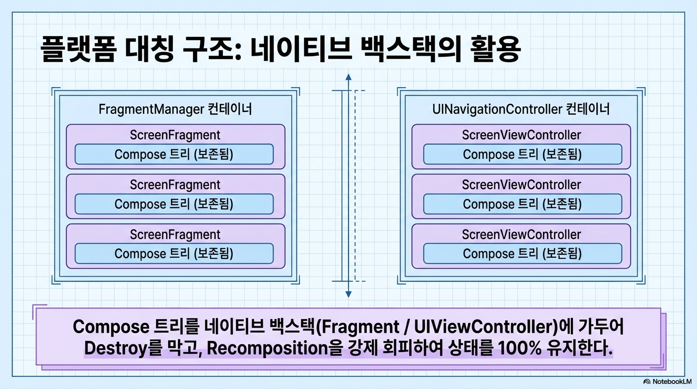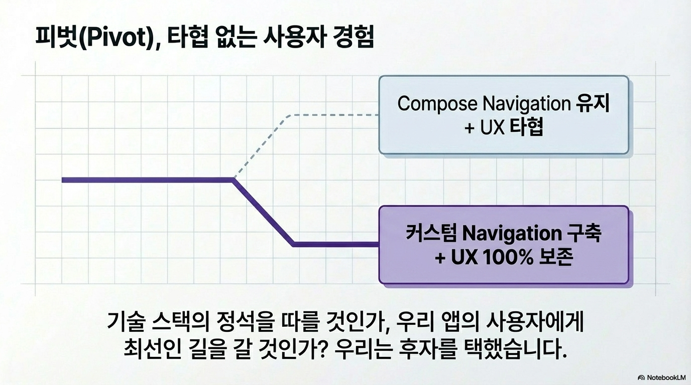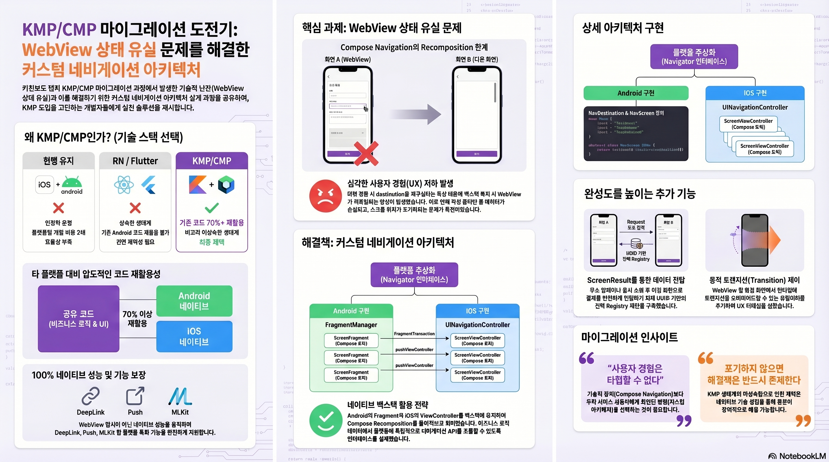 스포카의 Android 개발자가 키친보드 앱을 Kotlin/Compose Multiplatform(KMP/CMP)으로 전환하며 겪은 도전과 해결책을 담은 기술 블로그 포스트입니다. 기존 코드의 70% 이상을 재활용할 수 있다는 효율성을 근거로 도입을 결정했으나, 표준 네비게이션 라이브러리 사용 시 웹뷰 상태가 초기화되는 기술적 한계에 직면하게 됩니다. 개발팀은 이를 극복하기 위해 안드로이드의 Fragment와 iOS의 UINavigationController를 결합한 플랫폼 특화 커스텀 네비게이션 아키텍처를 설계함으로써 사용자 경험을 완벽히 보존했습니다. 결론적으로 이 글은 기술 스택의 미성숙함이 장애물이 될 수 없음을 강조하며, 문제의 본질을 꿰뚫는 창의적인 해결책을 통해 프로덕션 환경에서 멀티플랫폼 마이그레이션이 충분히 가능하다는 통찰을 공유합니다.