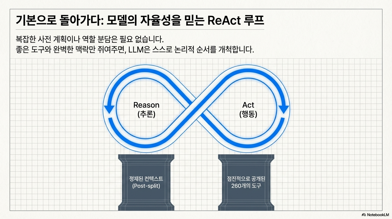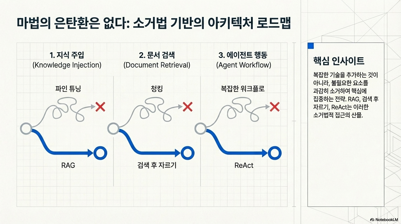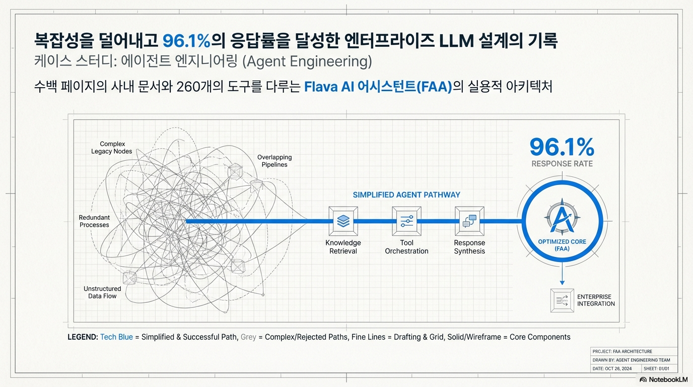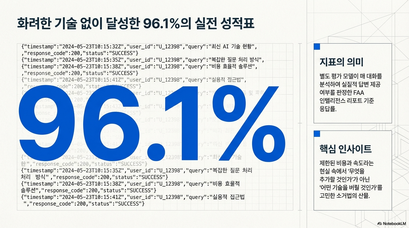 이 글은 엔터프라이즈 환경에서 고효율 AI 에이전트를 구축하기 위한 실질적인 기술 선택과 전략적 의사결정 과정을 다룹니다. 필자는 복잡한 최신 유행 기술을 무분별하게 도입하기보다, 단순함과 효율성에 집중하여 파인 튜닝 대신 RAG(검색 증강 생성) 방식을 채택하고 문서의 문맥을 보존하기 위해 검색 후 자르기(Post-split) 전략을 사용했다고 설명합니다. 또한 구조가 복잡한 멀티 에이전트 대신 ReAct(추론 및 행동) 루프를 활용함으로써 시스템의 복잡도를 낮추고도 높은 응답률을 달성하는 성과를 보여줍니다. 결과적으로 이 텍스트는 기술을 더하는 것이 아닌 본질적인 기능을 남기는 소거법을 통해 실제 비즈니스 문제를 해결하는 엔지니어링의 정수를 제안하고 있습니다.