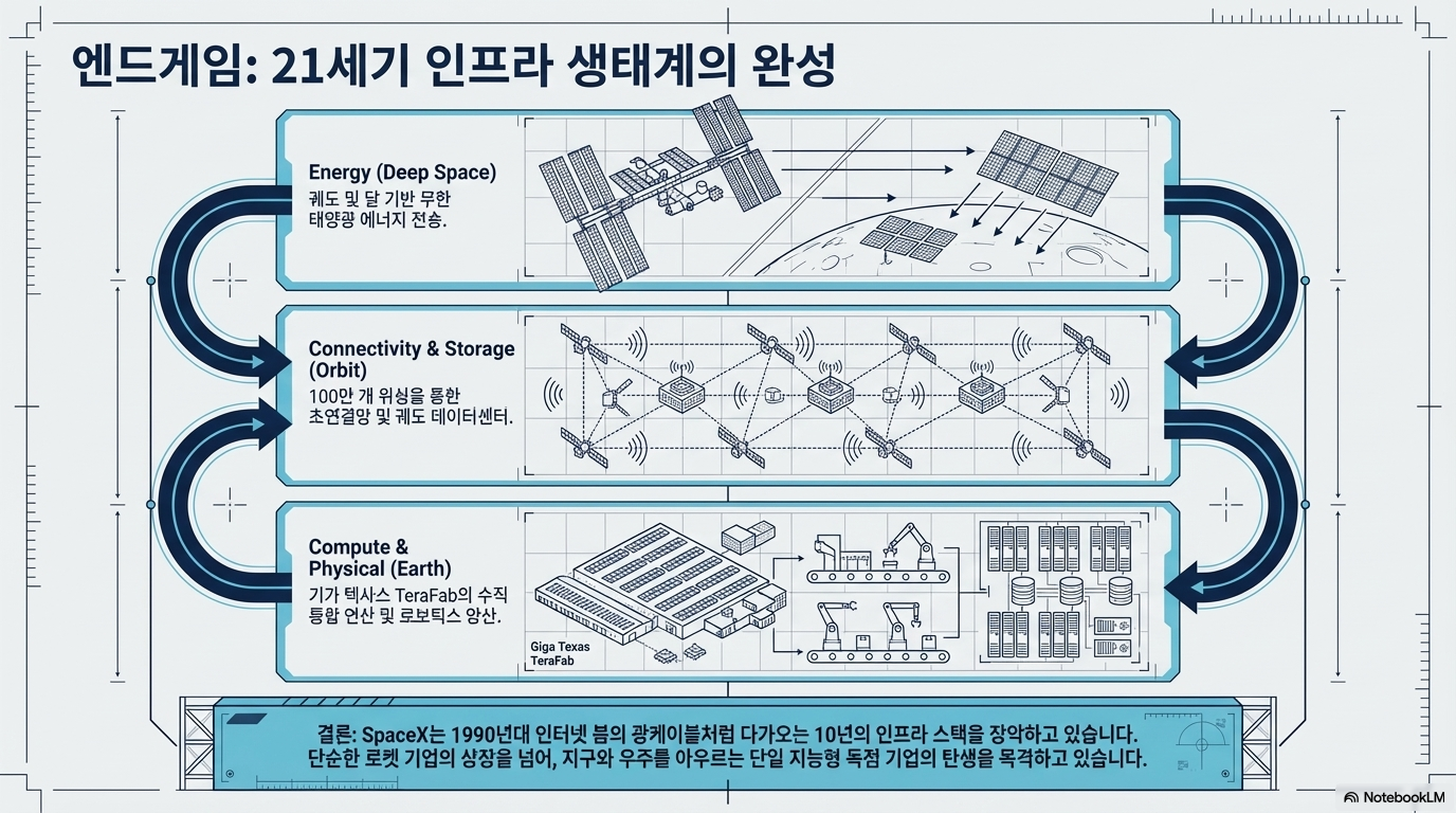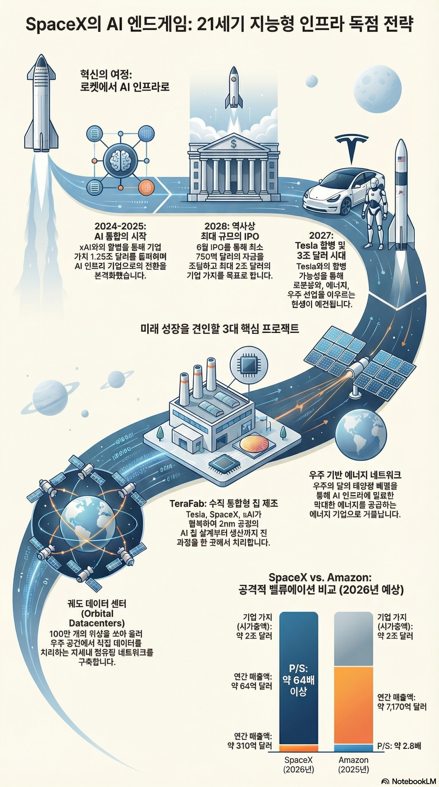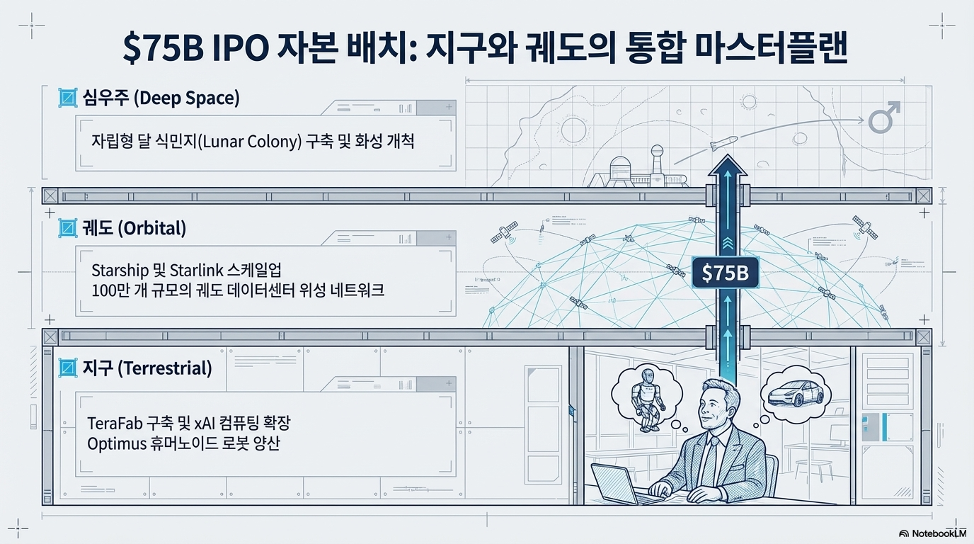 이 자료는 2026년으로 가정된 미래 시점에서 SpaceX의 기업 공개(IPO)와 그에 따른 AI 인프라 장악 전략을 심층 분석한 투자 안내서입니다. 본문은 일론 머스크가 SpaceX를 단순한 로켓 기업을 넘어 궤도 데이터 센터와 TeraFab이라는 거대 반도체 제조 시설을 운영하는 지능형 인프라 계층의 주인으로 변모시키려 한다고 설명합니다. 특히 Tesla와의 합병 가능성과 xAI를 포함한 수조 달러 규모의 기업 가치를 전망하며, 이러한 확장이 가져올 천문학적인 자금 조달과 실행상의 위험 요소를 동시에 다룹니다. 궁극적으로 이 텍스트는 인공지능 발전의 핵심 동력인 에너지와 연산 능력을 우주 공간에서 선점하려는 SpaceX의 거대한 야망과 미래 우주 경제의 구조적 변화를 체계적으로 조망하고 있습니다.