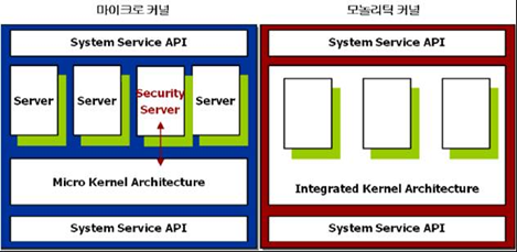 1. 마이크로 커널 : 프로세스/메모리 관리 등 핵심 기능만을 커널에 구현, 나머지 기능은 독립적 서비스 모듈로 구현하여 제공하는 운영체제 구조