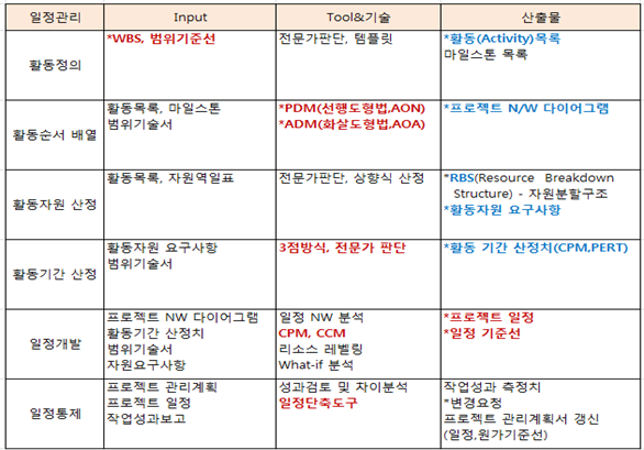 1. 프로젝트 일정관리 : 일정관리는 How,When 을 정의하는 것으로 달성 가능한 일정 계획수립과 실적 모니터링 및 일정 지연 시 대응 관리 방법