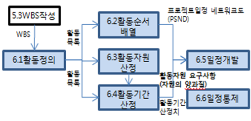 1) Activity정의 2) 활동순서배열 3) 활동자원산정 4) 활동기간산정 5) 일정개발 6) 일정통제