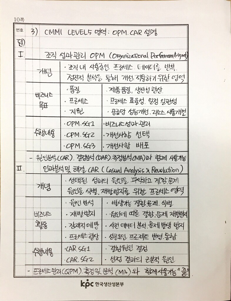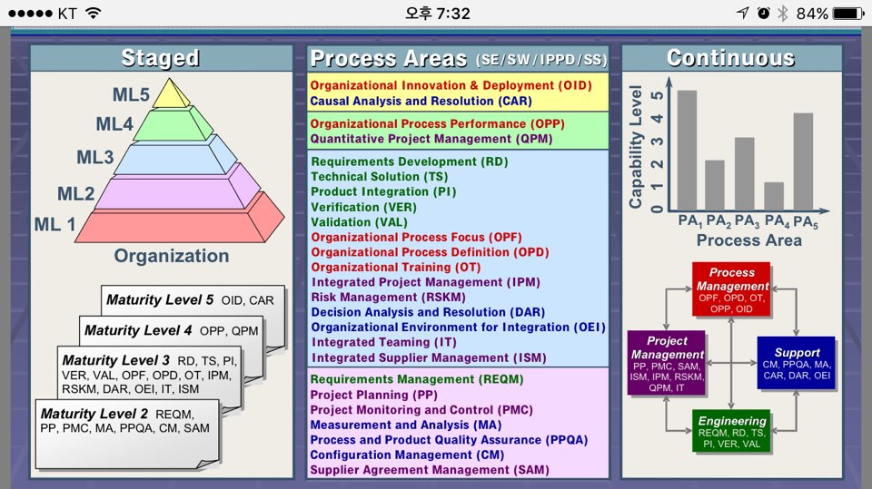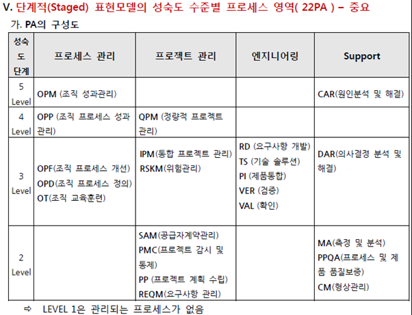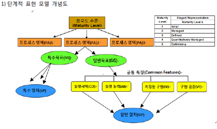- 조직차원의 성숙도 평가로 각 단계별 핵심프로세스 영역이 정의된 표현방식, 하위 프로세스 영역의 목표 달성해야 상위 성숙도 진전가능, 조직간 비교 가능