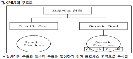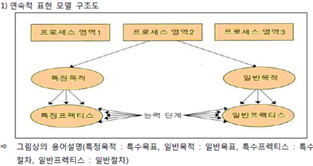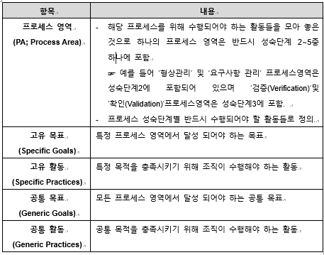 - Process영역(수행활동), Goal(달성목표), Practice(목표를 위한 활동), Common Feature(공동수행항목, 실행서약(CO), 실행능력(AB), 지정된구현(DI), 구현검증(CF))