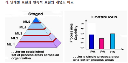 1) Staged(단계적표현) :SW-CMM 조직 전환용이, 성숙도레벨(1~5단계) - 초관정관최( Initial>Managed>Defined>Quantitatively Managed>Optimized)