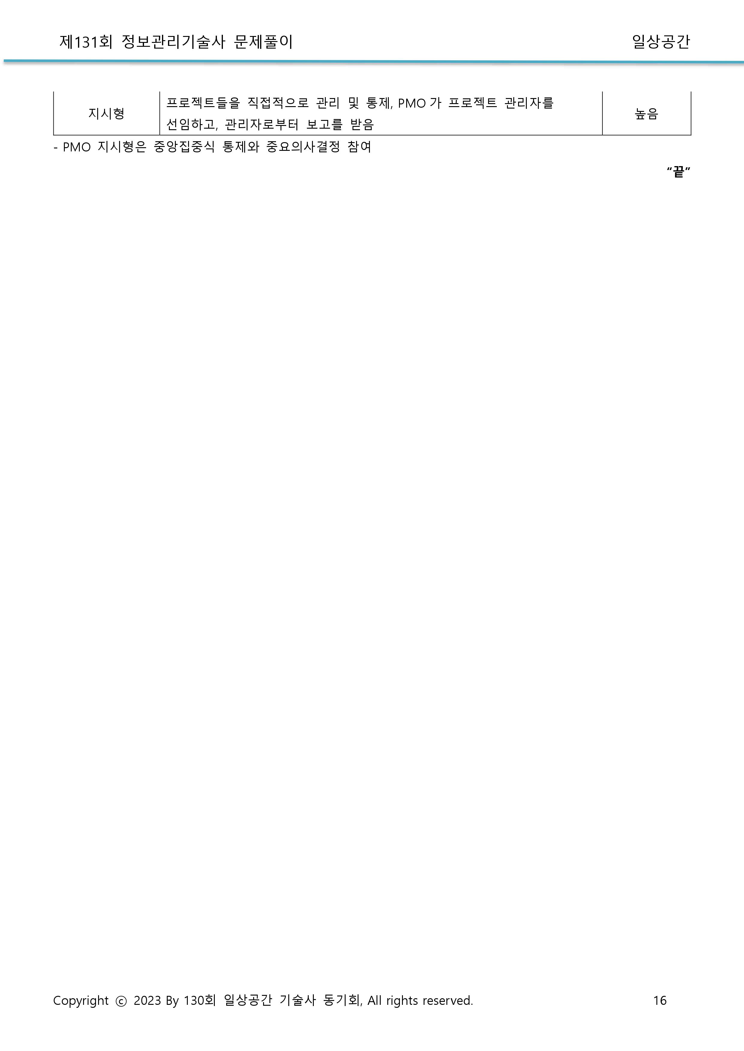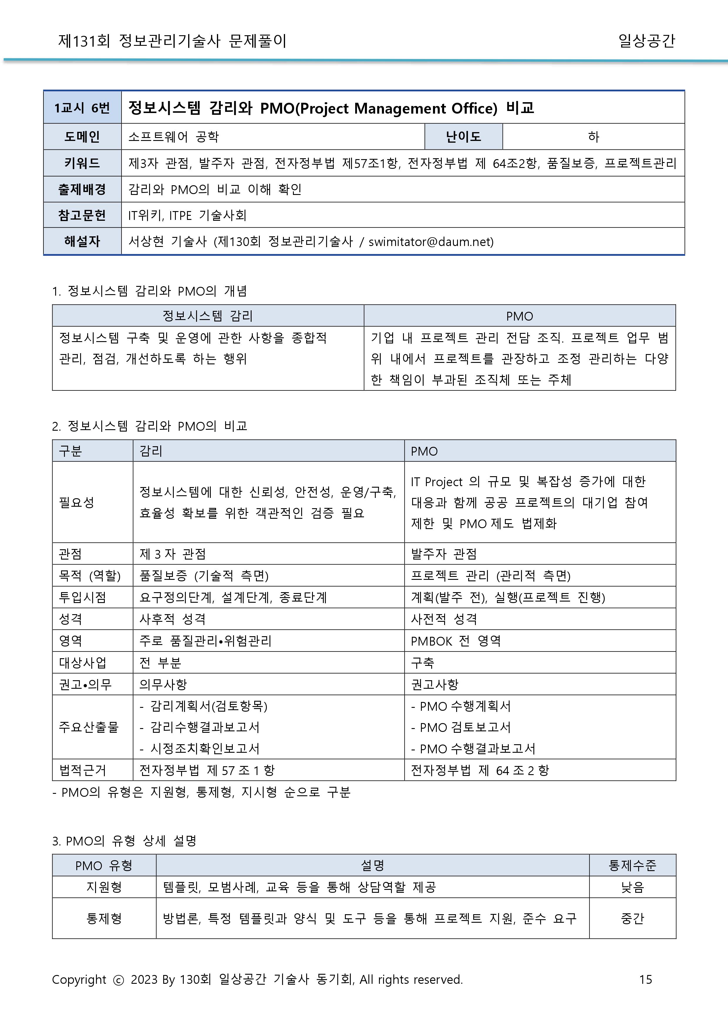 - 최근 공공PMO(Project Management Office)제도의 의무화 시행에 따라 이에 대한 관심이 높아지고 있다. 공공PMO제도에 관하여 아래의 질문에 답하시오.