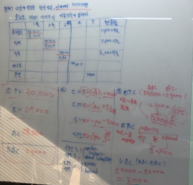 - CV(비용편차) = EV-AC || CPI(생산성) = EV/AC || TCPI(남은작업) = (BAC-EV)/(BAC-AC)