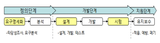 - 타당성검토 > 분석 > 설계 > 개발 > 시험 > 운영/유지보수