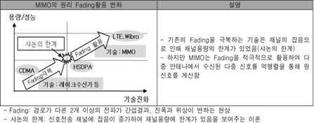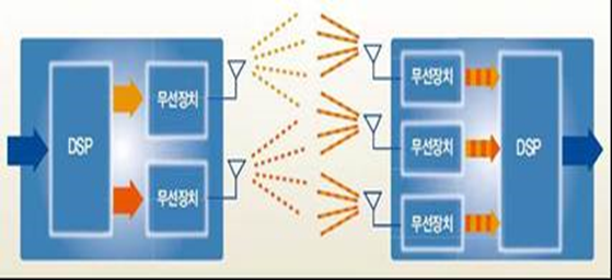 무선 통신의 용량을 높이기 위하여 기지국과 단말기에 여러 안테나를 사용하여, 사용된 안테나 수에 비례하여 용량을 높이는 다중 안테나 기술