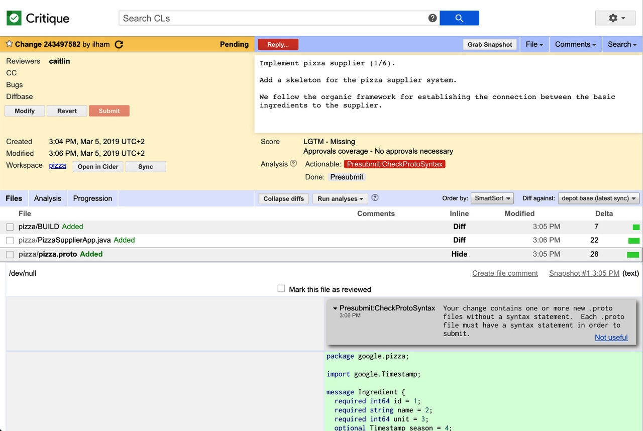 - 정적 분석기의 결과를 표시하여 중요한 결과를 강조하고 수정 제안을 제공. Critique 내에서 실행되는 자동화 테스트인 "presubmits" 를 포함