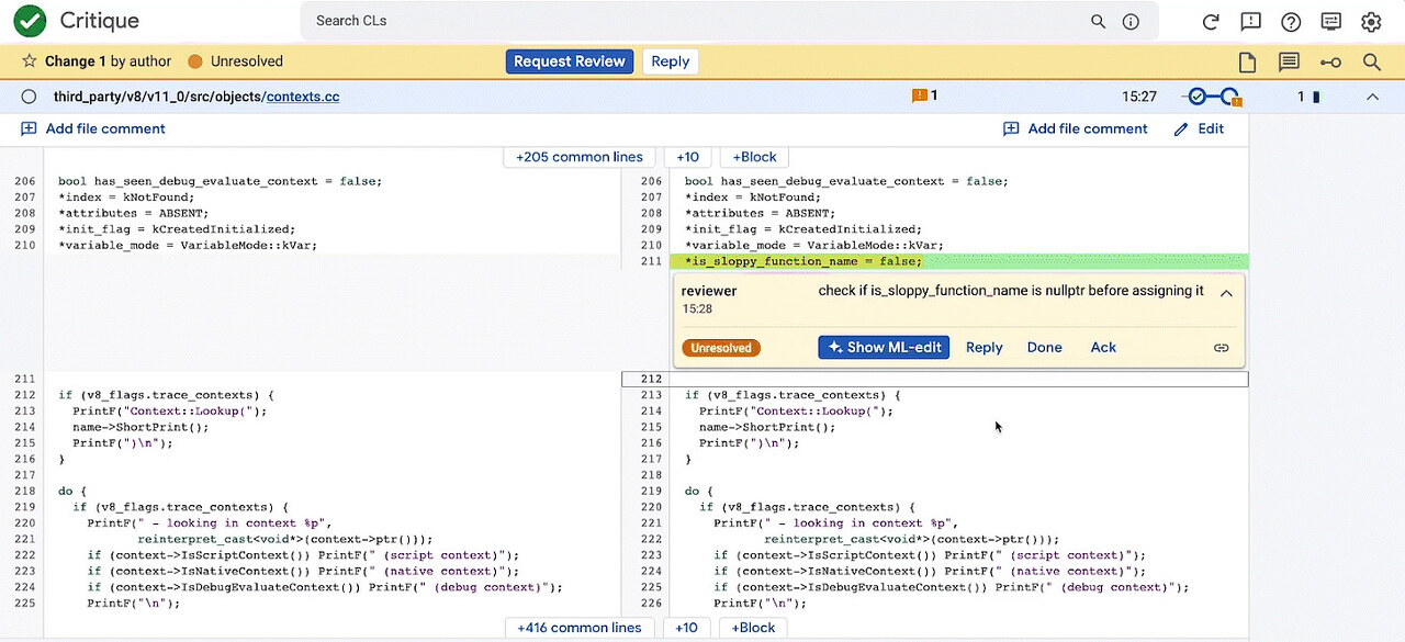 - 리뷰어가 코드에 코멘트를 남기면 Critique에서 ML 기반 편집 제안을 표시
