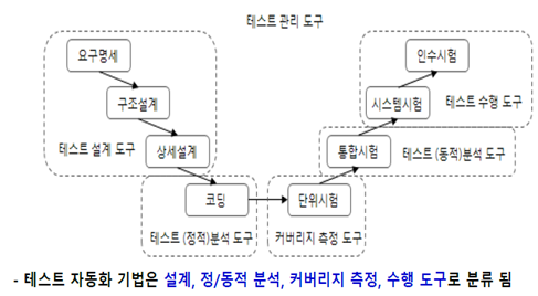 1. 테스트하네스/자동화 : 자동화된 test 프로세스를 제공하고, test 실행의 case를 제공하며, test 결과를 자동으로 생성해주는 소트프웨어 테스트 자동화 Tool