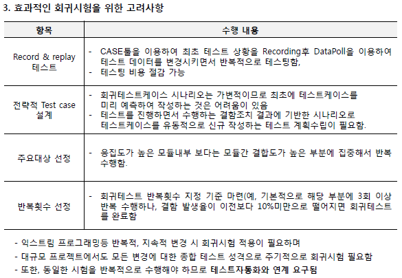 - 전략적 Testcase 설계 : 회귀테스트케이스 시나리오는 가변적임, 따라서 최초에 테스트케이스를 미리 예측 작성하는 것은 어려움, 테스트를 진행하면서 수행하는 결함조치 결과에 기반을 둔 시나리오로 테스트케이스 유동적으로 신규 작성하는 테스트 계획수립이 필요