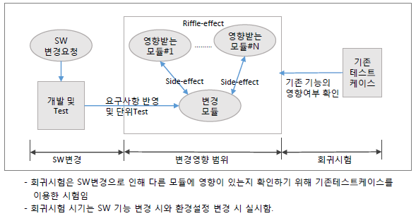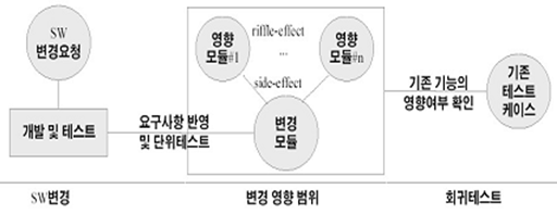 “수정(Modification)이 기대하지 않은 결과를 발생하지 않는다는 것을 증명하기 위한 시스템이나 컴포넌트에 대한 선택적 재테스트”로 소스코 드 수정되었을 때 의도치 않게 포함된 버그를 찾아낼 수 있도록 테스트를 수 행하는 기법