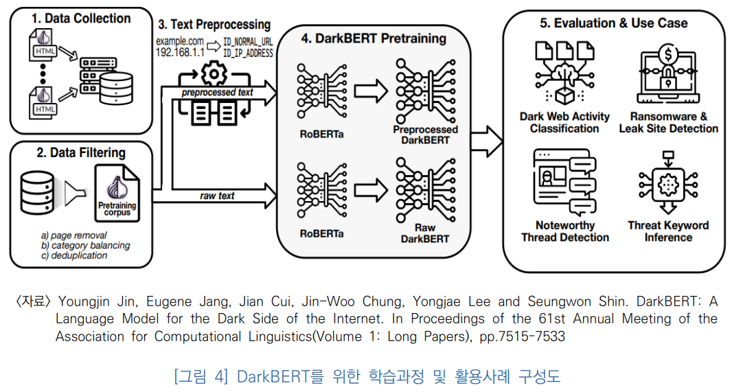 다크웹 전문 언어 모델 다크버트(DarkBERT)를 이용하면 해결 방안을 모색할 수 있다. 일반적인 데이터가 아닌 범죄행위 데이터를 수집하고 분석하여 범죄자들의 언어를 이해하고 추론하는 것이 가능해지면서 구체적인 범죄행위 분류와 위협 활동 모니터링으로 효과적인 범죄 데이터 분석과 대응이 가능.