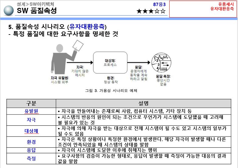[개념]요구사항과 관련된 품질속성을 도출하고 구체적으로 명세하며, 시스템에 대해 자극과 반응을 측정함으로써 품질요구사항을 찾아내기 위한 시나리오