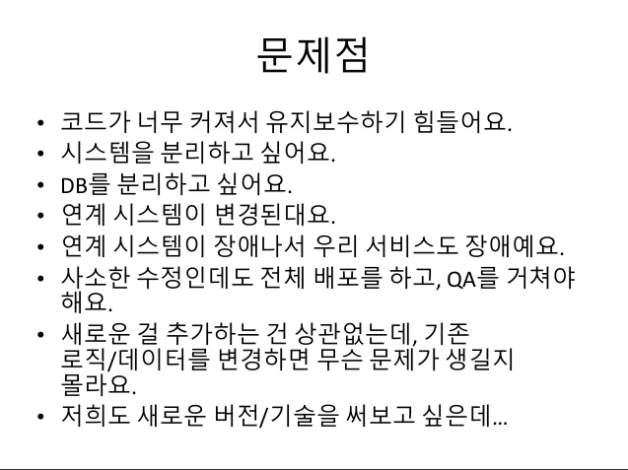 - 기능 결합, 모놀리식 구조, 긴 릴리즈 주기에 문제가 있었음