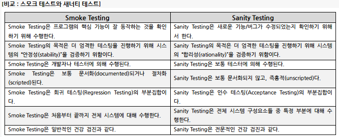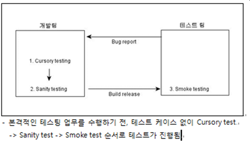2) 본격적인 테스팅 업무를 수행하기 전, 테스트 케이스 없이 Cursory test-> Sanity test -> Smoke test 순서로 테스트가 진행됨