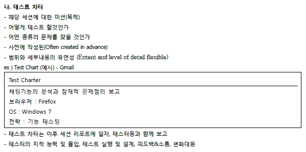 2) TimeBox (시간제한) : 테스터는 정해진 시간 내에 테스트 차터를 수행