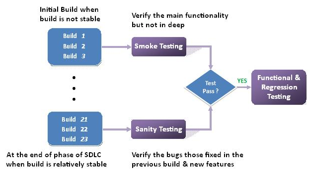 - 소프트웨어 릴리스 이전에 수행하는 간단한 사전 테스트로써 (이때 심각한 문제가 발견되면 소프트웨어 릴리스가 중지됨) sanity test, confidence test, build verification test (BVT), build acceptance test와도 혼용되어 사용됨