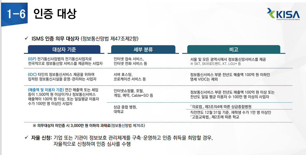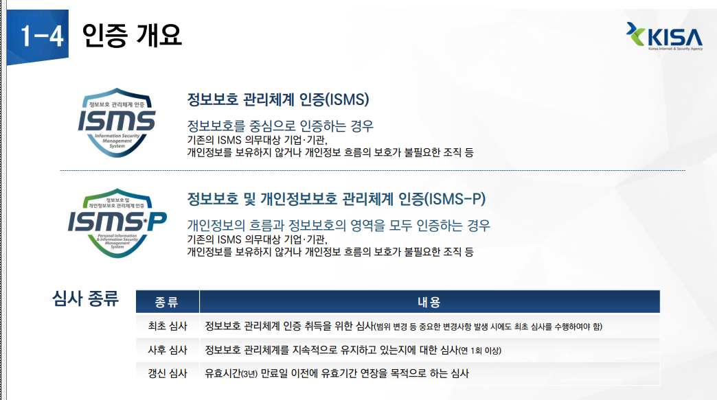 * 정보보호 관리체계(Information Security Management System) 인증 : 정보보호 관리과정, 보안대책 등 정보보호 관리체계의 적정성을 심사하여 인증하는 제도