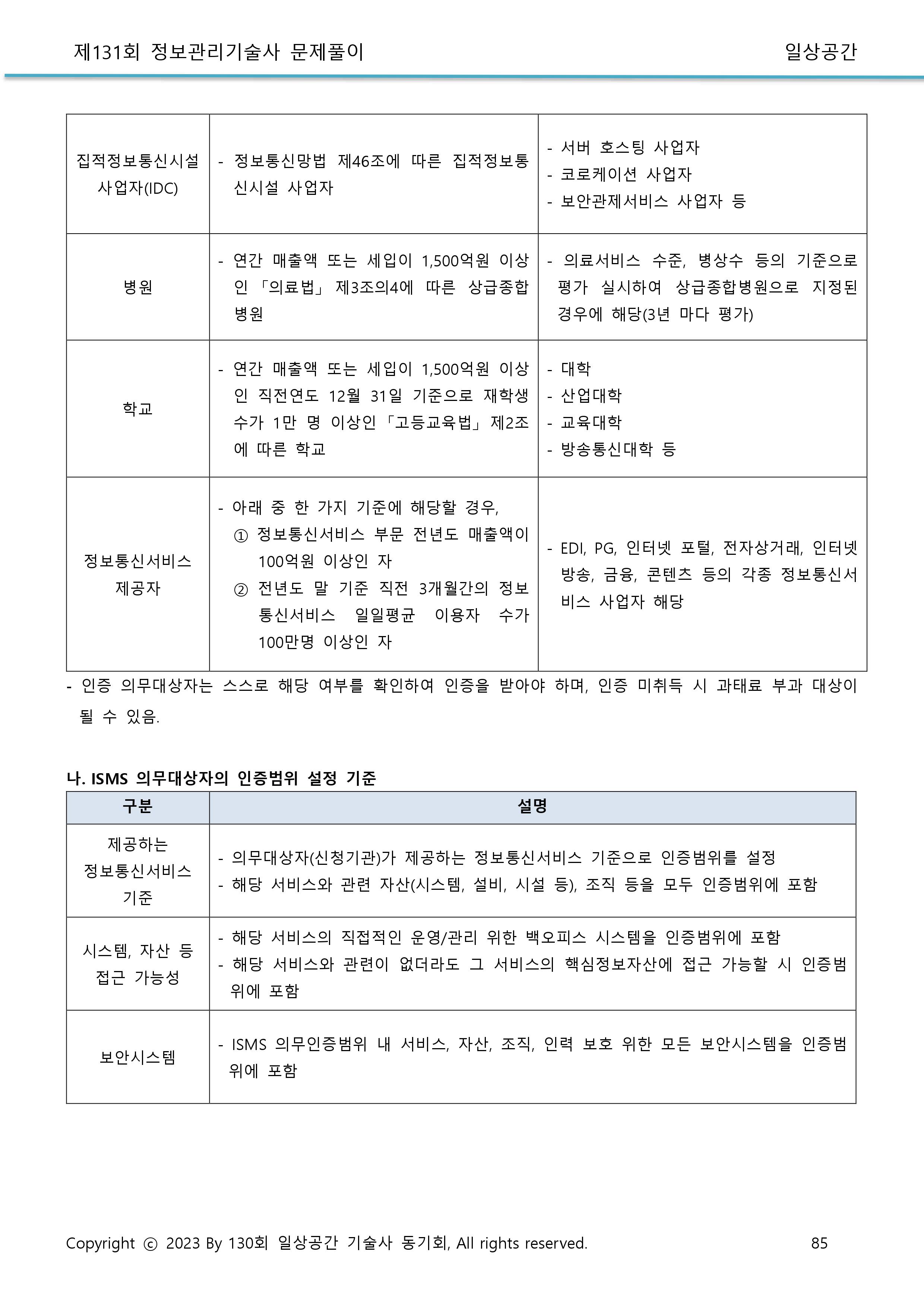 * ISMS 인증기준 : 80개(관리체계 수립 운영 16개 + 보호대책 요구사항 64개)