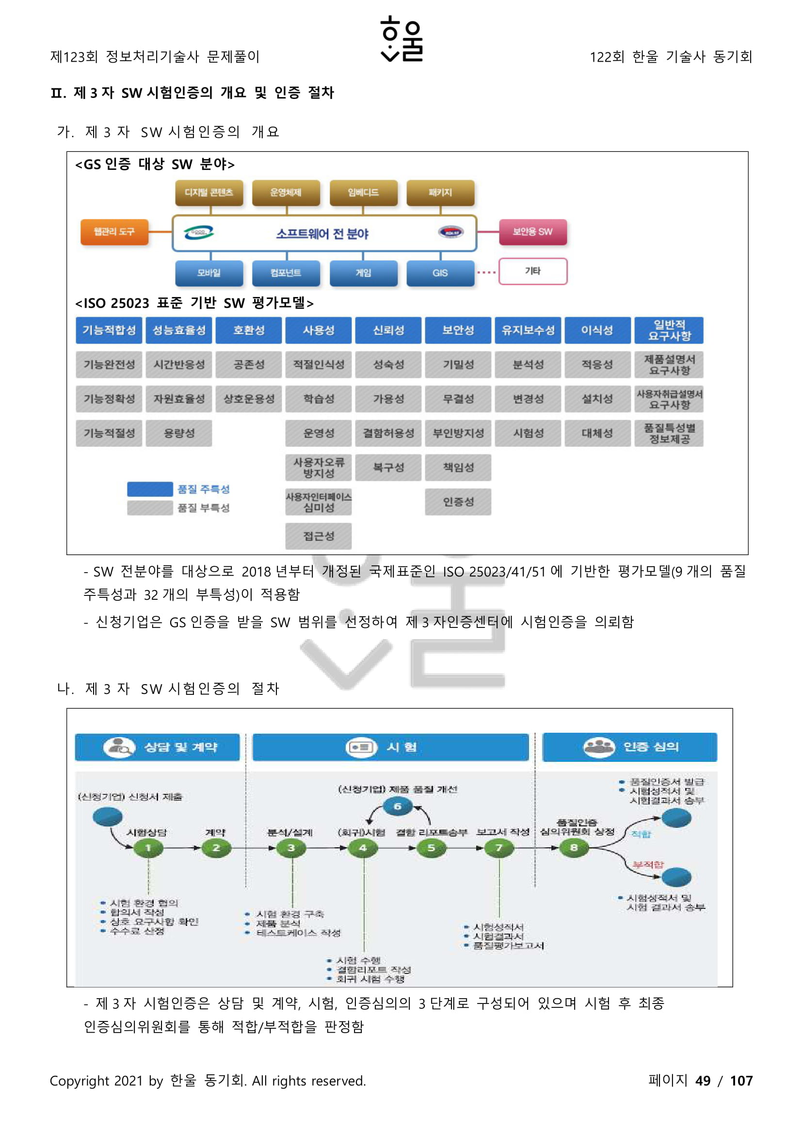 1.국내 SW완성도를 평가해 일정수준 이상의 기신사(기술력, 신뢰성, 사용성)을 갖춘 제품에 부여하는 품질인증제도
