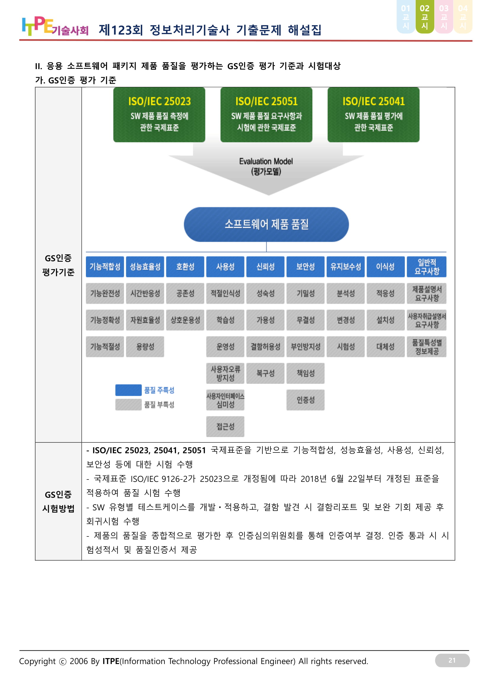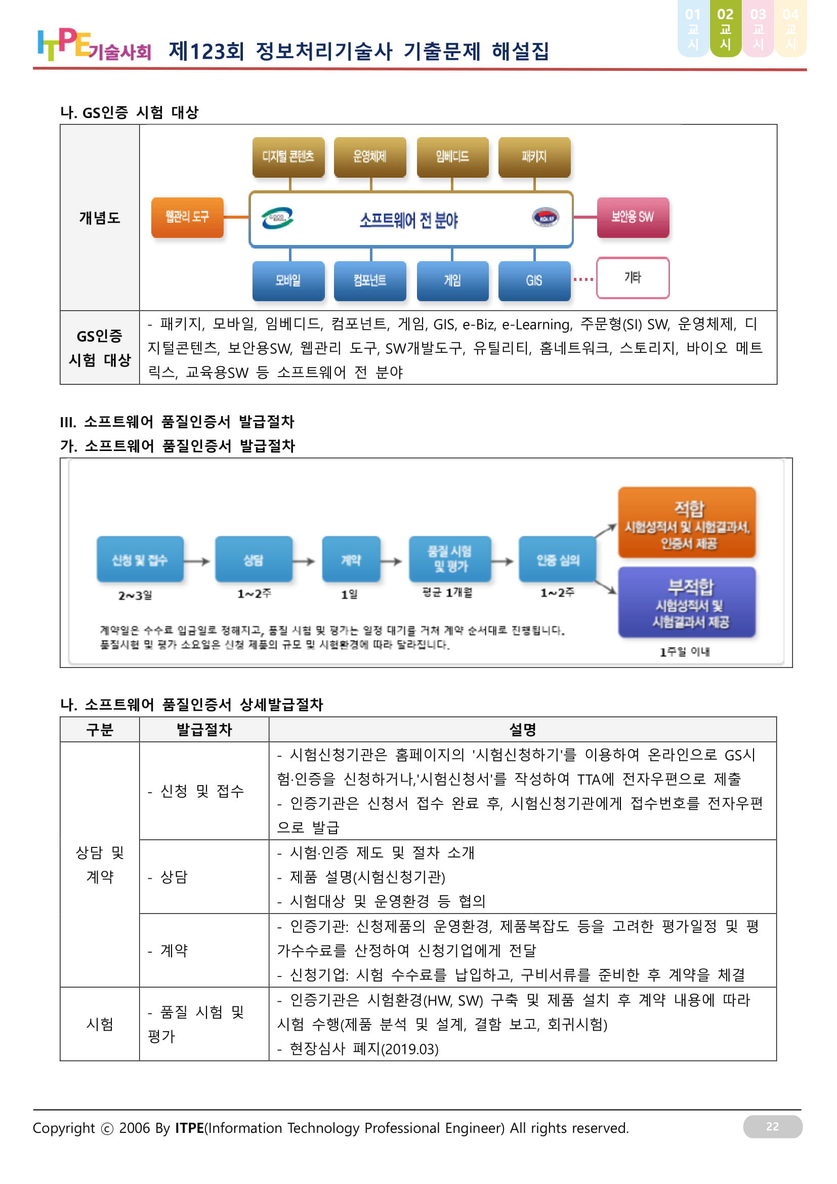 GS인증제도는 문서심사만으로 인증을 부여하는 제도와 달리 고객이 사용하게 될 실제 운영환경의 테스트베드를 갖춰, 철저히 제품(프로그램, 제품설명서, 사용자설명서) 품질을 인증하는 제도다. 시험·인증 대상은 일반 패키지 소프트웨어부터 보안 소프트웨어, ERP, CRM 등 기업용 소프트웨어에 이르기까지 다양하며, 프로그램뿐만 아니라 사용자 설명서를 시험·인증대상에 포함시켜 제품을 평가하고 있다. GS인증 시험은 ISO/IEC25023, 25041, 25051 국제표준을 기반으로 기능성, 신뢰성, 사용성, 효율성, 유지보수성, 이식성 등에 대한 시험을 수행한다.