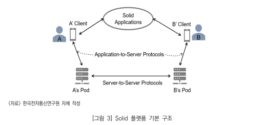 Solid는 기본적으로 팀버너스리가 제안한 링크드 데이터(Linked Data) 원칙에 기반하 며, 사용자가 소셜 미디어를 위한 데이터 소유권을 갖도록 권한을 부여한다. 이를 위해 사용자 데이터를 애플리케이션으로부터 분리하고, 데이터의 완전한 제어를 소유자에게 분산된 방식으로 제공하도록 설계되었다. 사용자 데이터를 애플리케이션으로부터 분리하기 위해 Solid는 Pod(Personal Online Datastore)의 개념을 도입한다. 사용자의 Pod는 사용자의 모든 정보를 독립적으로 저장하며, 다양한 형태로 구현될 수 있다. Pod에 있는 정보에 접근하기 위해서는 모든 사용자는 URI 형태의 Web ID 기반으로 인증을 받아야 한다. 사용자의 데이터 제어를 위해 Solid는 데이터 소유자가 지정한 인증 정책을 기반으 로 Pod에서 데이터에 대한 액세스 제어를 할 수 있도록 지원한다. 즉, Pod 내 정보에 대한 요청에 대한 응답은 사용자가 작성한 ACL(Access Control List) 파일에 기반하여 분산 액세스 제어 메커니즘인 WAC(Web Access Control)에 의해 제어된다.