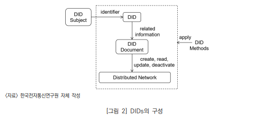 DIDs는 검증 가능하며 분산형 디지털 식별을 제공하는 새로운 형태의 식별 체계로 정 의되며 어떠한 중앙집중형 등록소(Registry), 식별제공자(Identity Providers) 또는 인증 기관(Certificate Authority)과도 독립적으로 제어, 구현될 수 있도록 하는 것을 목표로 한다. 따라서 기존의 중앙집중형 방식에 비해 특정 기관에 대한 의존이나 단일 고장점 (Single Point of Failure)에 대한 문제없이 인터넷 서비스를 위한 신뢰기반을 구축할 수 있다는 장점을 가진다. DIDs는 식별하는 대상인 DID Subject, 식별자인 DID(Decentrlaized Indetifier), DID에 관련된 정보를 포함하는 DID Document, DID Document가 저장 관리되는 분 산 네트워크(Distributed Network) 및 DID와 DID Document가 처리되는 방식을 규정 하는 DID Method로 구성된다([그림 2] 참조).