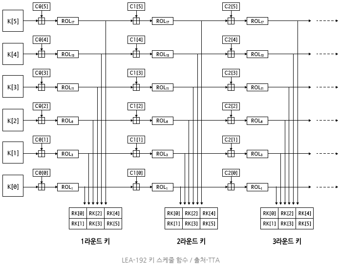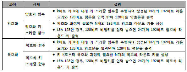 LEA의 라운드 함수는 32비트단위의 ARX연산만으로 구성하여 이들 연산을 지원하는 범용32비트 플랫폼에서 고속으로 동작할 수 있도록 설계됨