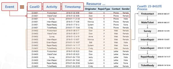 프로세스 마이닝 기법을 적용하기 위해서는 적절한 이벤트 로그를 추출하는 것이 필수다. 이때 꼭 필요한 데이터는 케이스 아이디, 액티비티, 타임 스탬프로 세 가지다. (자료=퍼즐데이터)