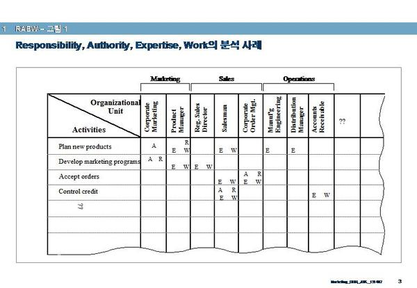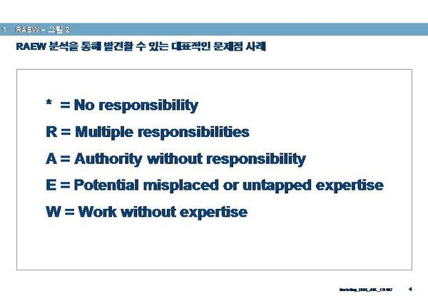이번에 소개드릴 Toolbox는 이런 진단 작업, 혹은 미래의 조직 구성 방법을 설계하는 경우에 유용하게 사용할 수 있는 조직 진단/설계 방법론으로서 RAEW라고 불리웁니다. RAEW는 Responsibility – 책임 -, Authority – 권한, Expertise – 전문성, Work – 실제 업무 수행의 약자를 모아서 만든 것인데요, 이 네가지 요소가 바로 조직 내에서 범부서적으로 업무가 수행될 때 꼭 필요한 4가지 요소이며 이 4가지가 조화롭게 연계될 수 있어야 업무가 원활하게 흘러갈 수 있게 된다는 사고에 기초하고 있습니다.