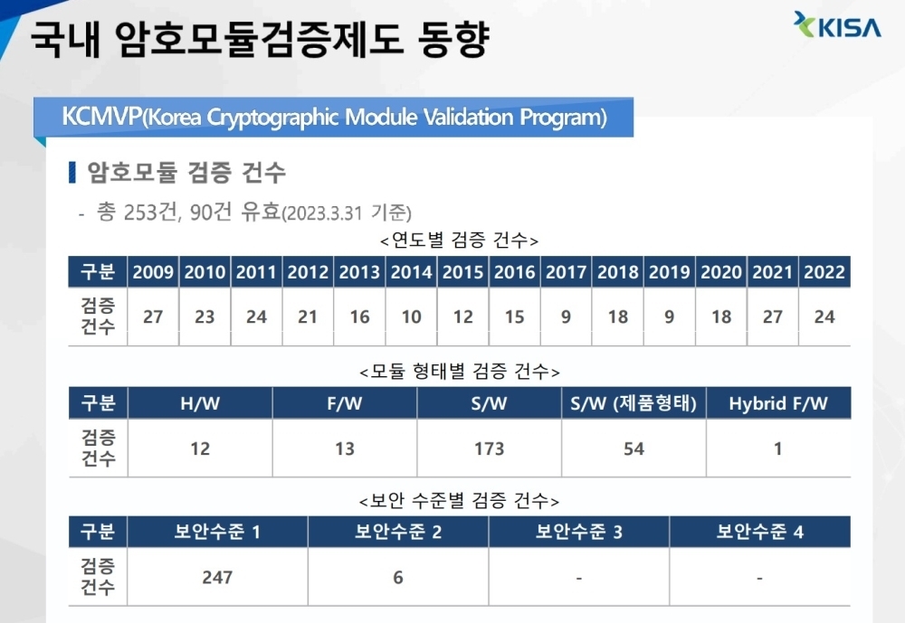 KCMVP는 행정기관 등 국가·공공기관의 중요 정보를 보호하기 위해 도입하는 암호모듈의 안전성과 구현 적합성을 검증하는 제도로, 국산 알고리즘을 탑재한 암호모듈에 대한 구현의 적합성, 안전성 등을 검증한다. 시험·평가기관으로는 KISA와 국가보안기술연구소가 지정돼 있으며 국가정보원이 검증하고 있다.