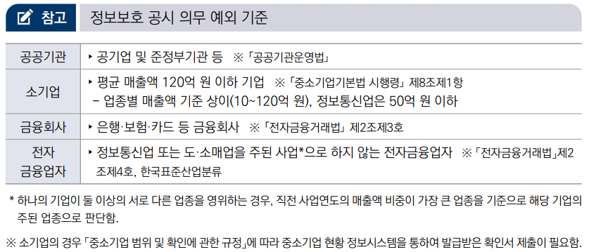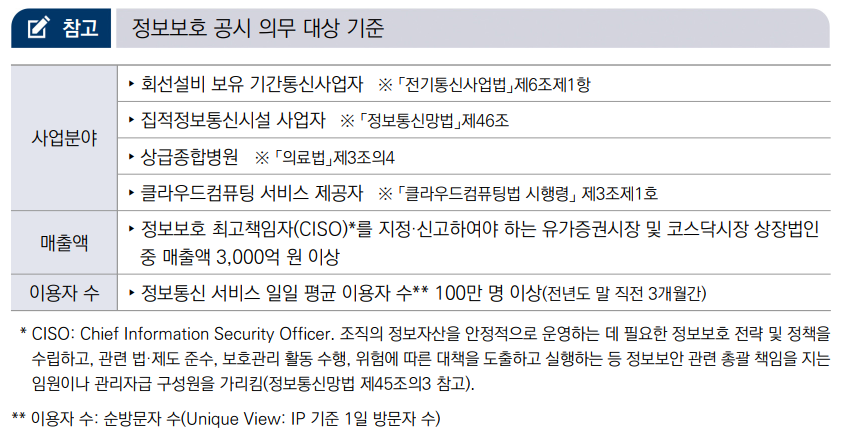 -(의무공시) 사업분야, 매출액 및 서비스 이용자 수 등을 고려하여 대통령령으로 정하는기준에 해당하는 자(정보보호산업법 제13조제2항, 이하 ‘정보보호 공시 의무자’라 한다.)