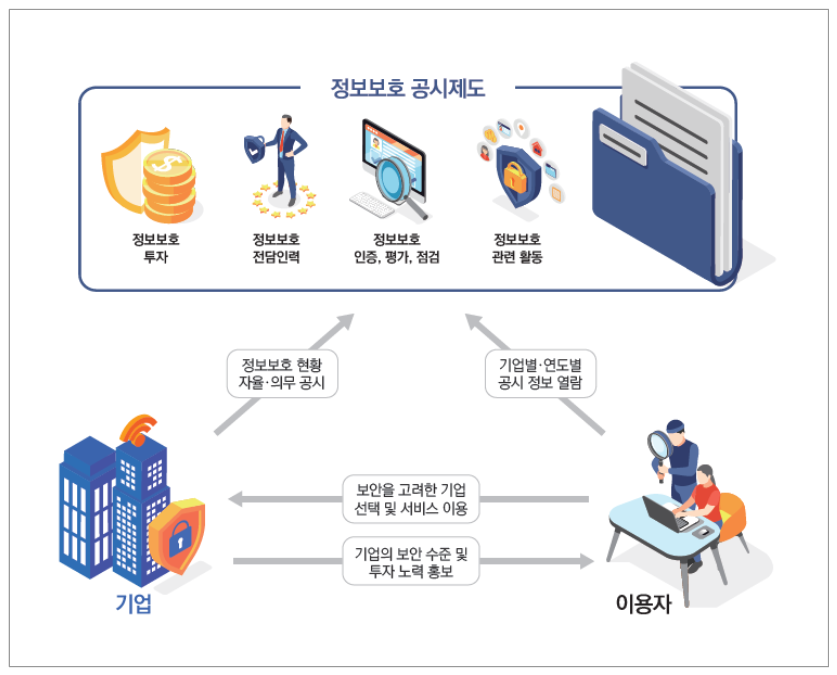 (개념) 정보보호 공시제도는 이용자 보호 및 알권리를 보장하고 기업의 자발적인 정보보호 투자를촉진하기 위한 제도